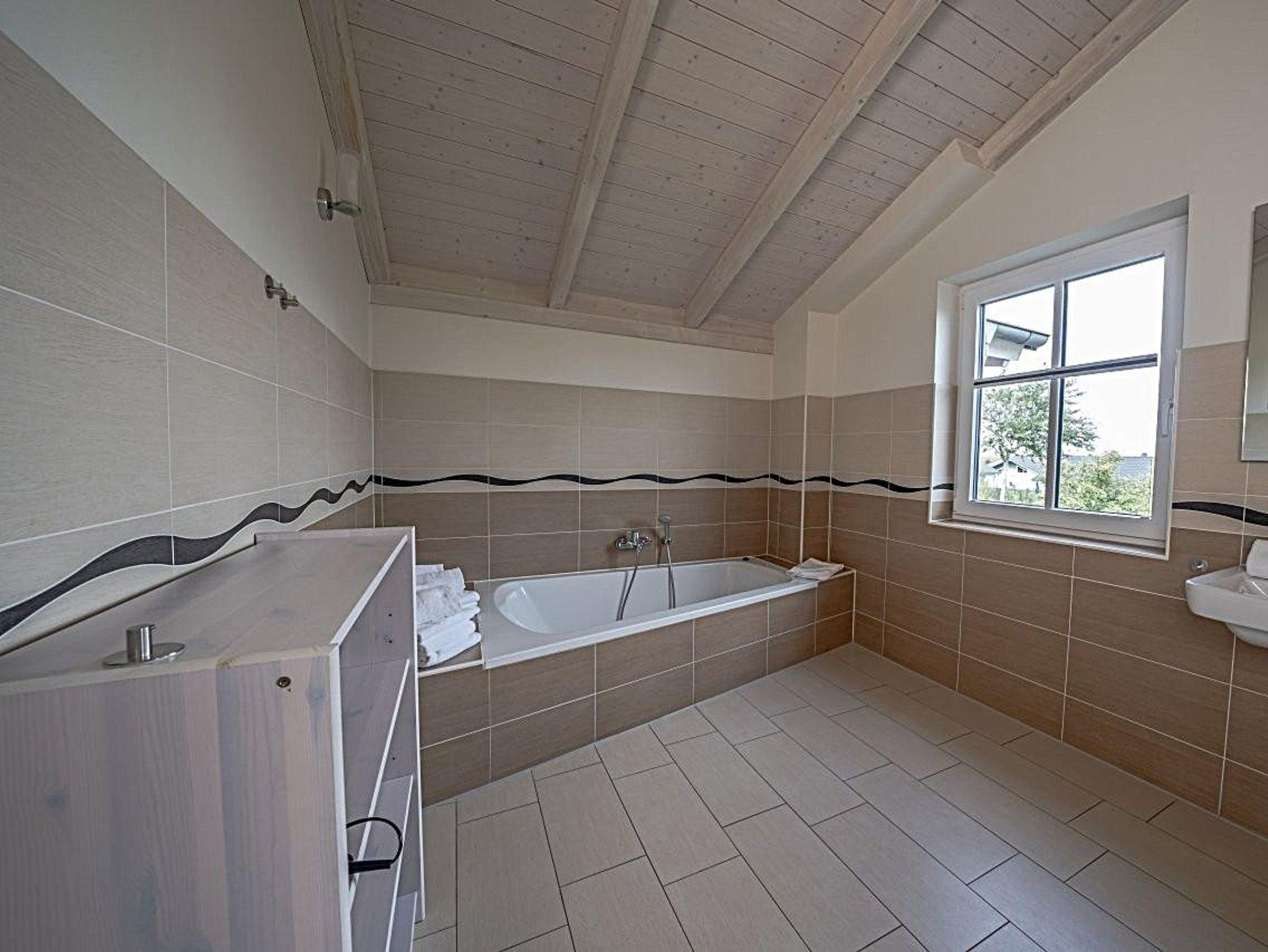 Im Obergeschoss erwartet Sie ein Wellnessbad mit großzügiger Sauna und einer XXL-Badewanne für zwei Personen. Drei Schlafzimmer bieten angenehme Rückzugsorte, während der helle Wohnbereich mit Kaminofen und voll ausgestatteter Küche zum Verweilen einlädt.