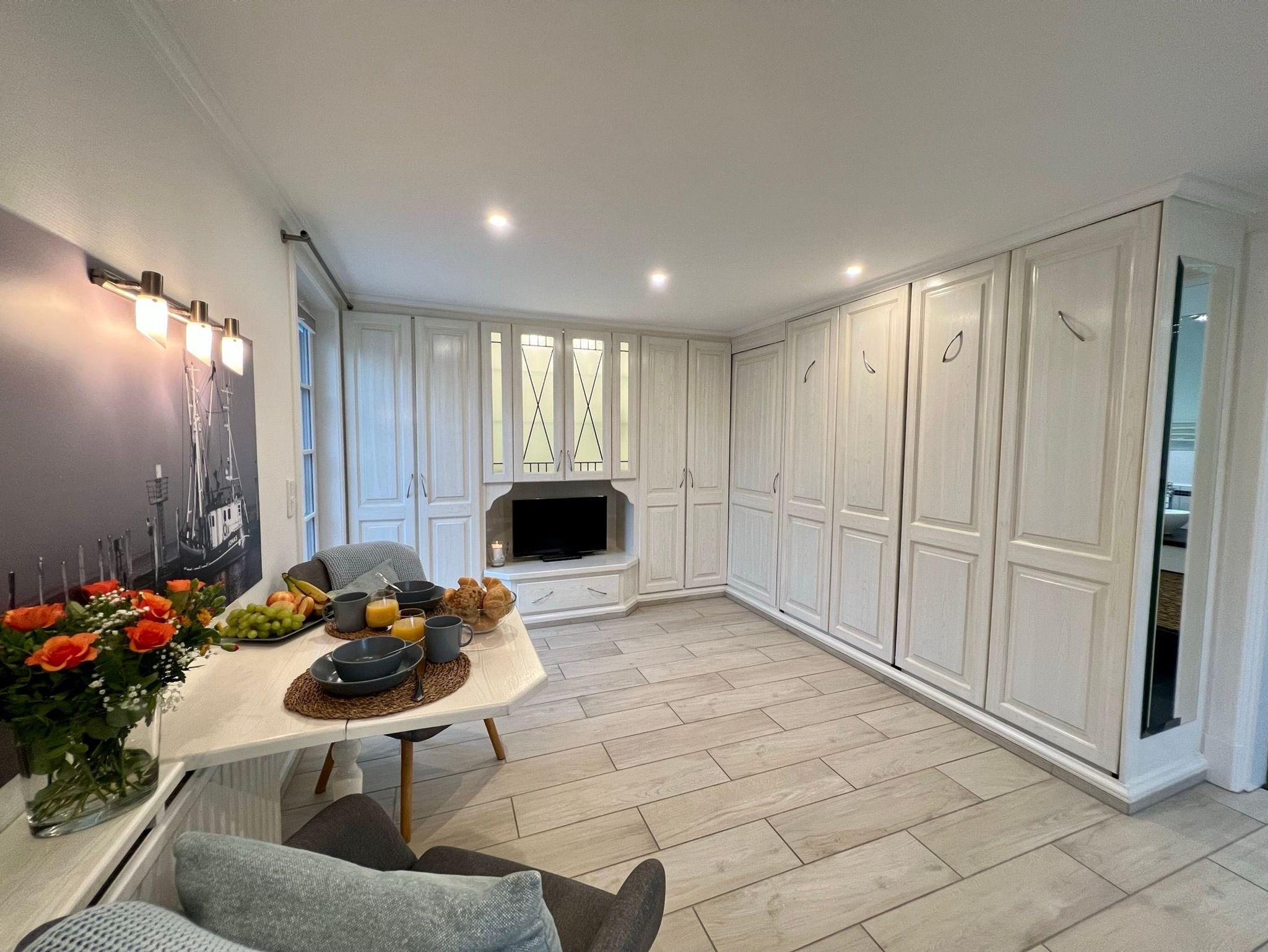 Das komfortable, ausklappbare Schrankbett macht die Wohnung besonders praktisch und gemütlich. Genießen Sie ein Frühstück im Bett.