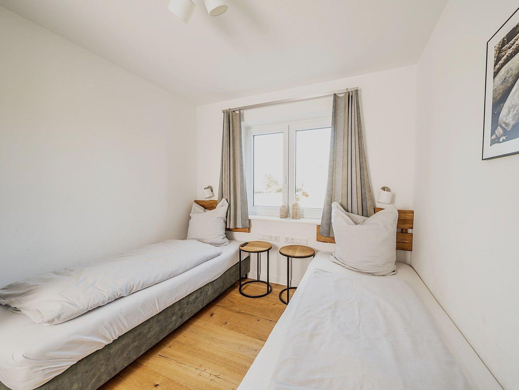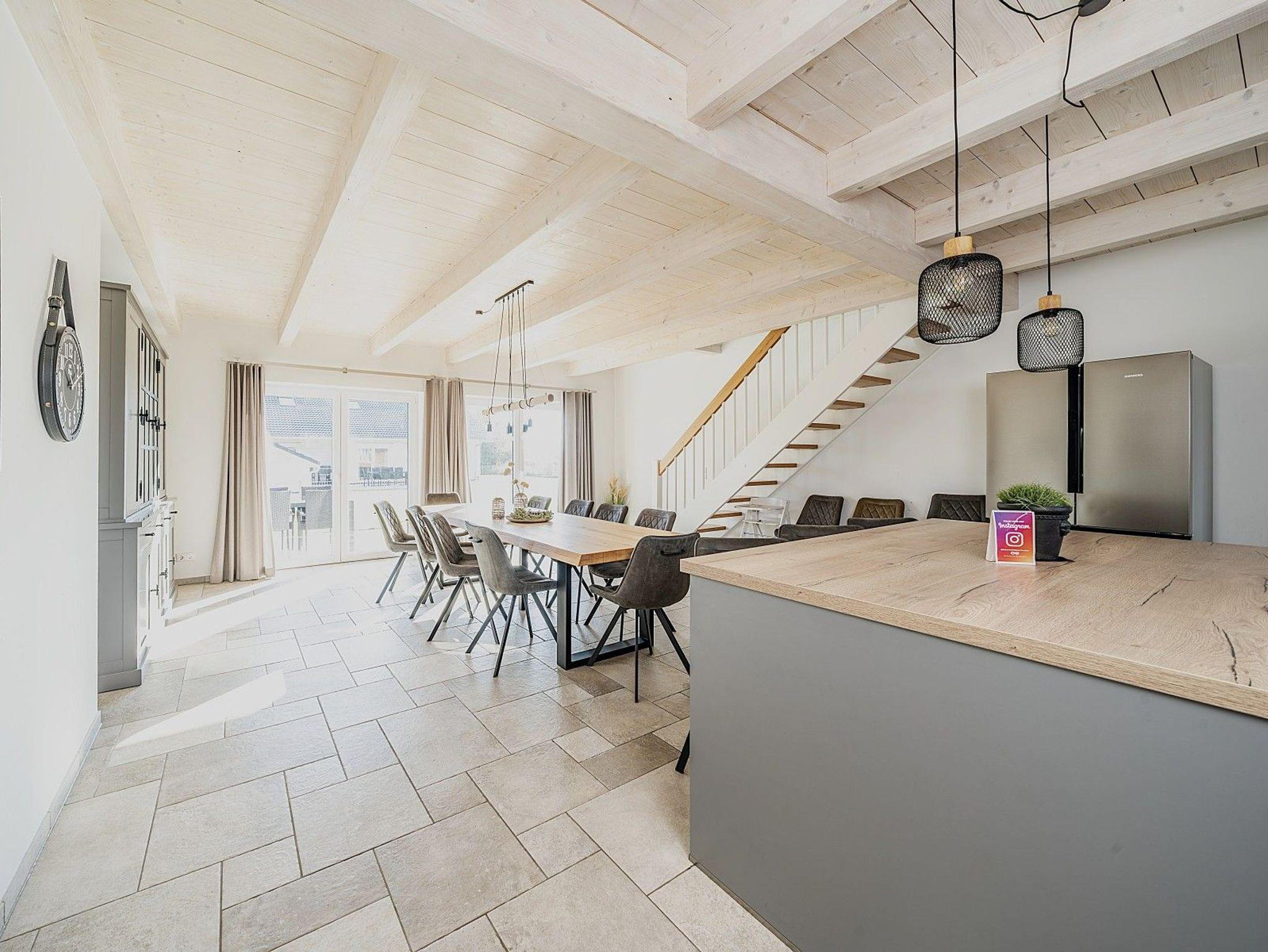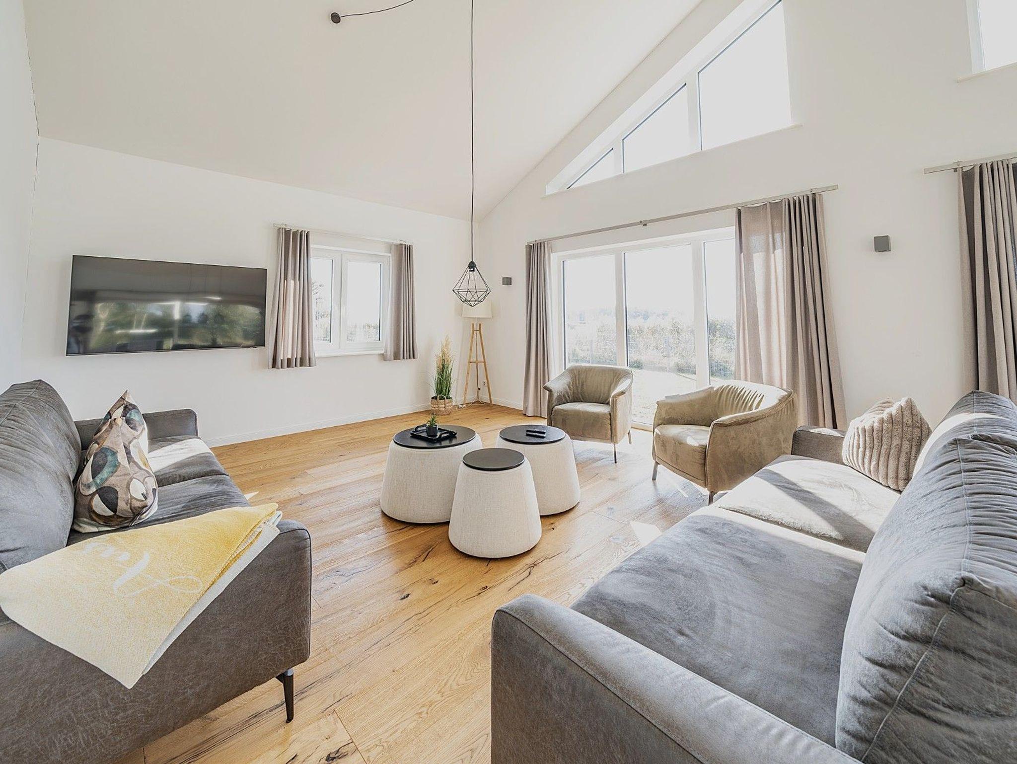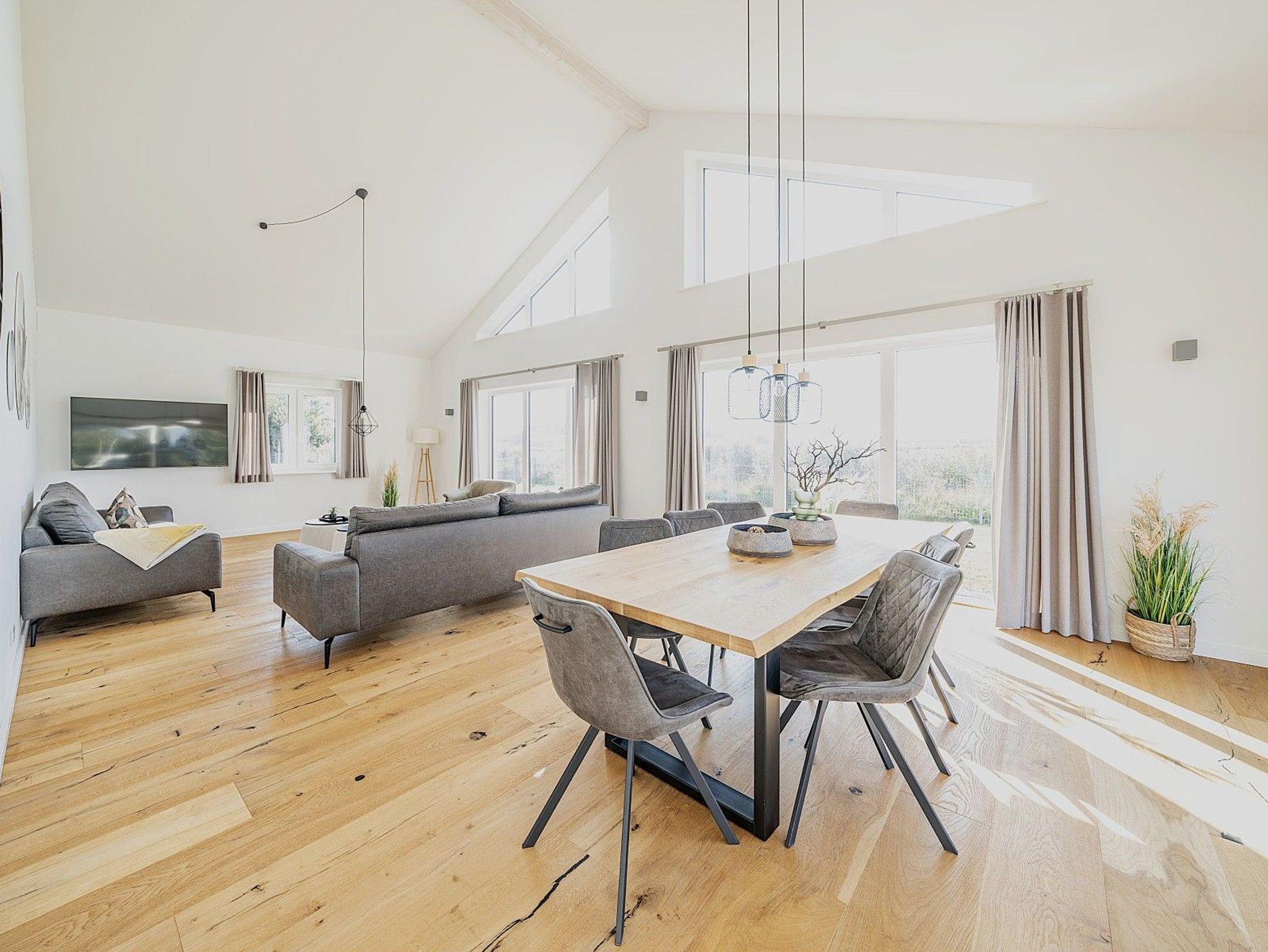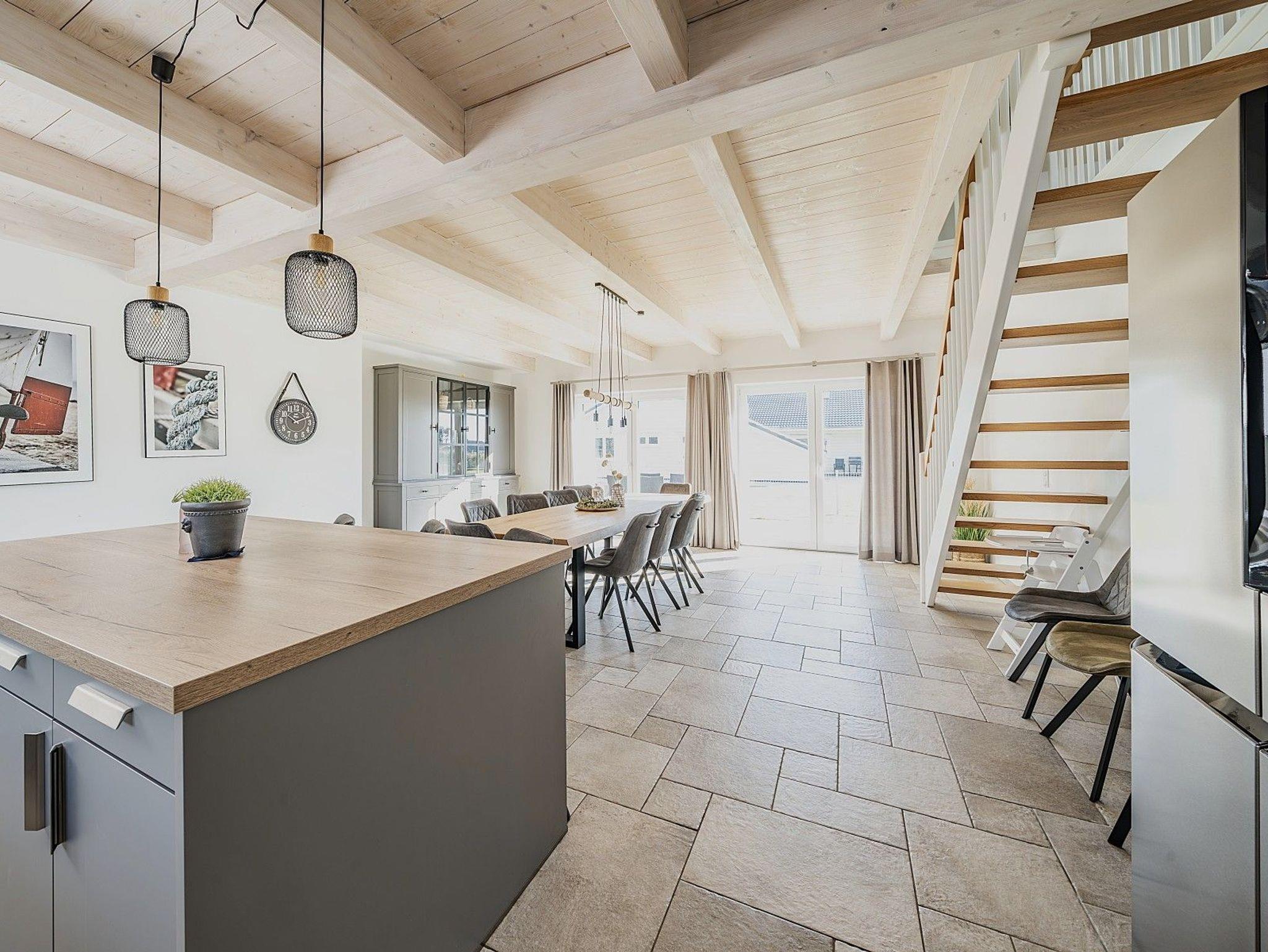 Der großzügige Wohnbereich mit bodentiefen Fenstern schafft eine helle, einladende Atmosphäre und bildet den Mittelpunkt des Hauses. Eine moderne Küche, ein großer Esstisch und gemütliche Sitzbereiche laden zu geselligen Stunden ein. Sechs Schlafzimmer und vier Bäder bieten ausreichend Platz und Privatsphäre. Nach einem Tag an der frischen Nordseeluft sorgt die hauseigene Sauna für Entspannung und Wärme.