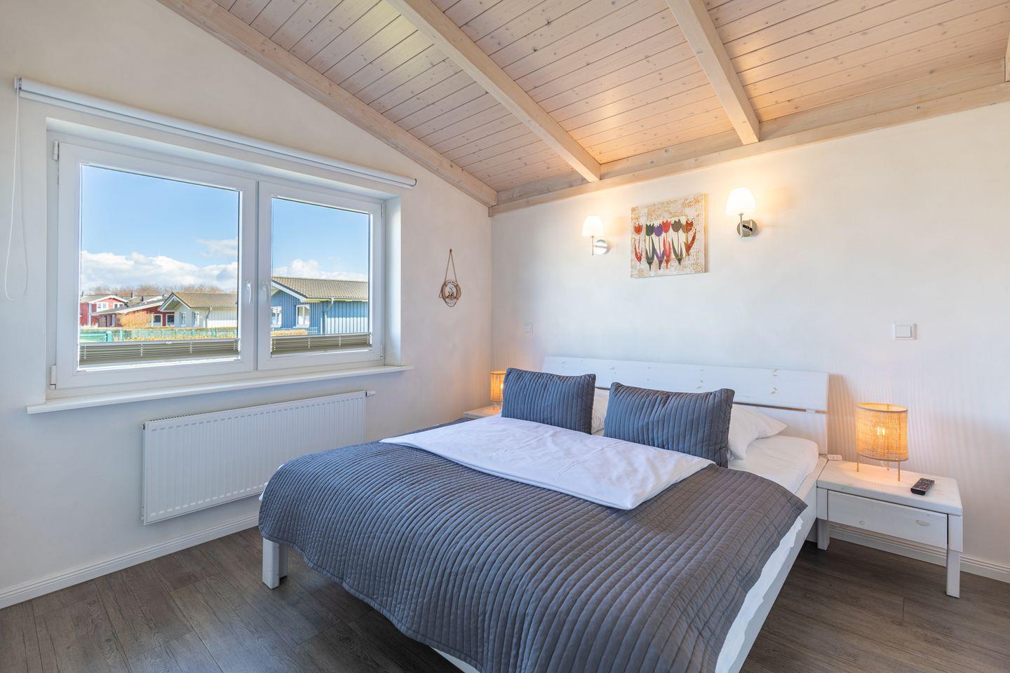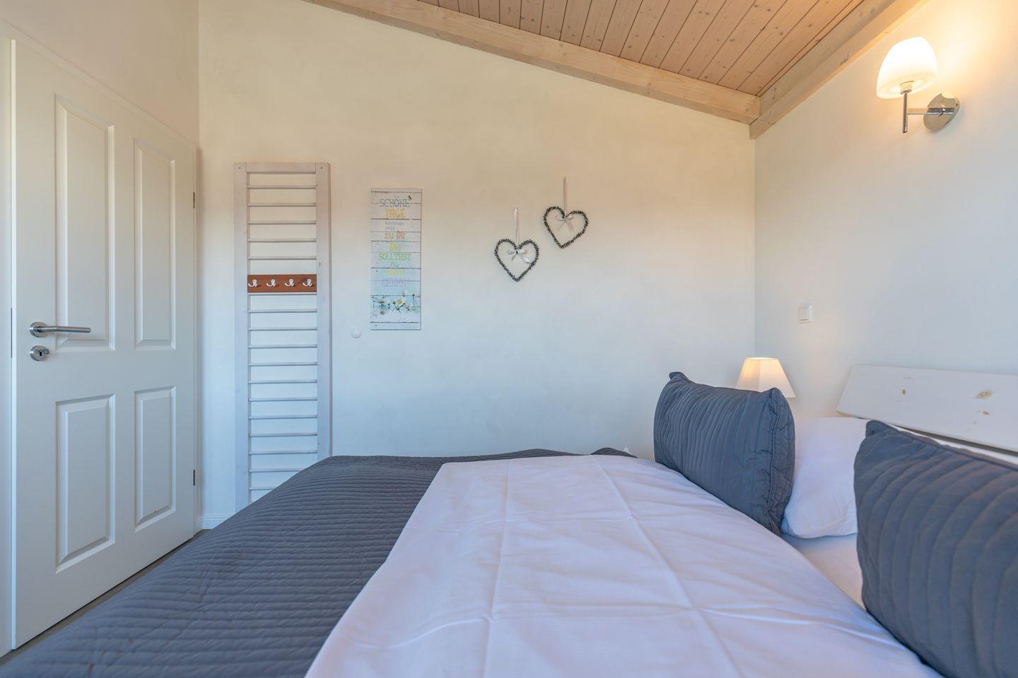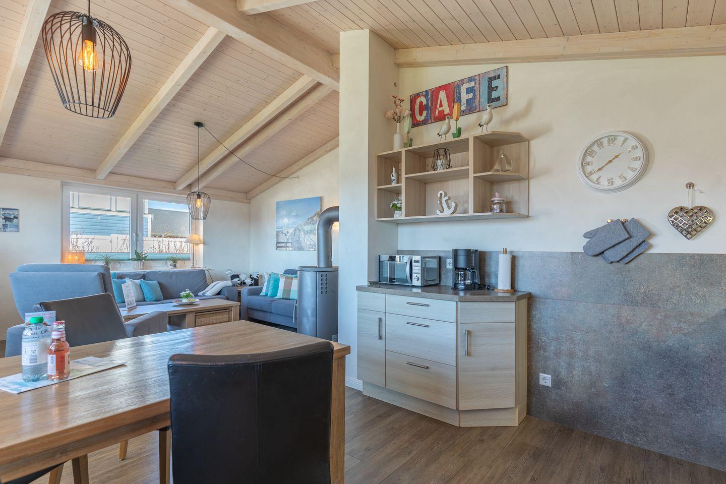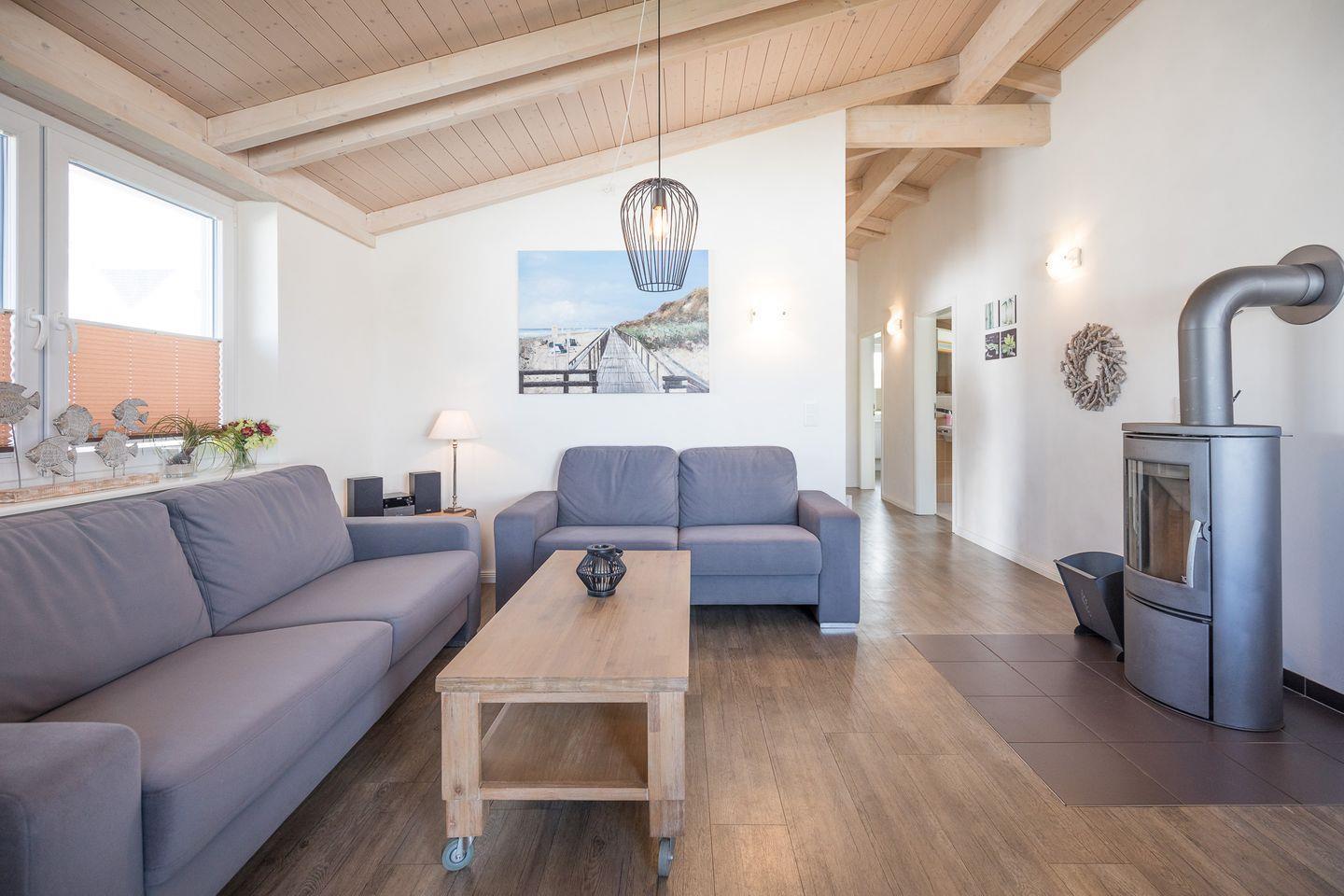 Das 85 qm große Ferienhaus ist modern und exklusiv im skandinavischen Charme eingerichtet. Die zwei Schlafzimmer mit jeweils einen Komfort-Doppelbett (180 x 200 cm) bieten Platz für bis zu vier Personen. Das gemütliche Wohnzimmer ist mit SAT-TV und einem Blu-Ray-DVD-Player ausgestattet. Der Kaminofen sorgt auch in der kälteren Jahreszeit für behagliche Stunden. Die offene Küche bietet Ihnen eine exklusive und umfangreiche Ausstattung, die das Herz eines jeden Hobbykochs höher schlagen lässt: Ceranfeld mit 4 Kochplatten, Backofen, Kühlschrank mit ***Gefrierfach, Mikrowelle, Geschirrspüler, Filterkaffeemaschine uvm. Das Badezimmer lässt keine Wünsche offen: zwei Waschbecken, eine große Badewanne, eine ebenerdige Dusche und eine schöne Sauna geben Ihrem Urlaub den richtigen Rahmen. Das Ferienhaus verfügt über ein zusätzliches WC. Auf der überdachten, windgeschützten Terrasse können Sie auf bequemen Gartenstühlen, den Sonnenliegen oder im Strandkorb die Sonne genießen.