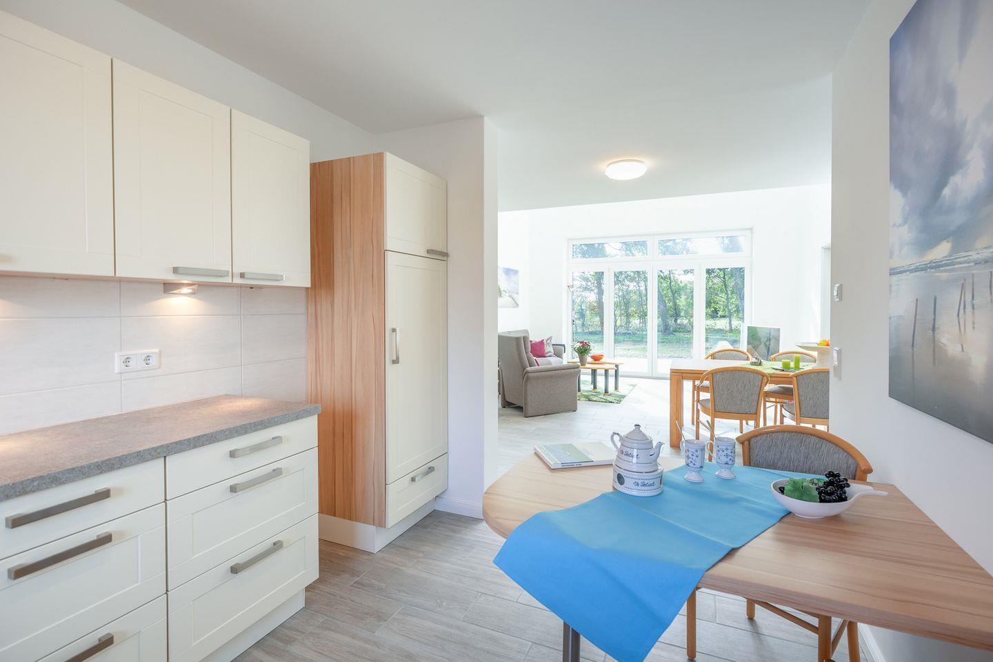 Das 70 qm große Apartment ist modern eingerichtet. Die offene Küche ist komfortabel mit einem 4-Platten-Kochfeld, einen Kühlschrank mit Gefrierfach, Geschirrspülmaschine, eine Kaffeemaschine (Filtergröße 4), Toaster, Wasserkocher und Geschirr eingerichtet. Der helle Wohnbereich ist mit einem bequemen Sofa und Sessel ausgestattet. Der SAT-TV und WLAN bieten Ihnen Unterhaltung auch im Urlaub.