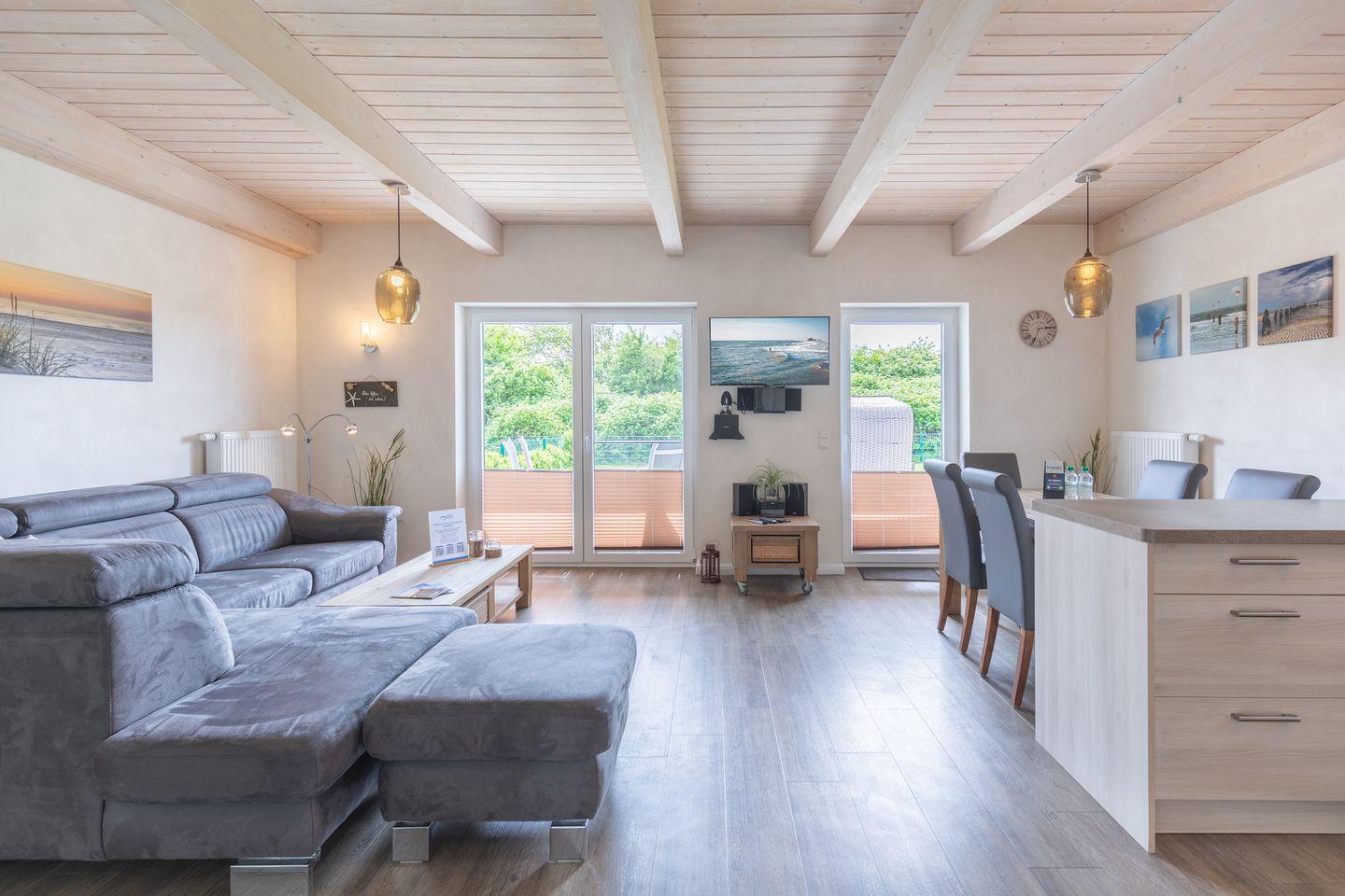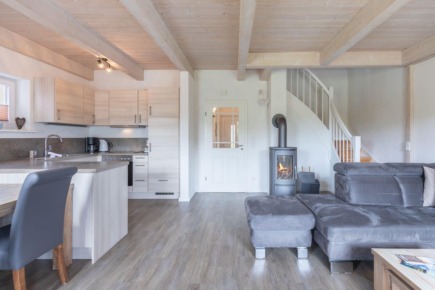 Das 100 qm große Ferienhaus ist modern und exklusiv im skandinavischen Charme eingerichtet. Zwei Schlafzimmer sind mit jeweils einen Komfort-Doppelbett (180 x 200 cm) ausgestattet, ein Schlafzimmer im Erdgeschoss bietet Ihnen ein Eck-Etagenbett, sodass Sie insgesamt für bis zu sechs Personen Platz finden. Das gemütliche Wohnzimmer ist mit SAT-TV und einem Blu-Ray-DVD-Player ausgestattet. Der Kaminofen sorgt auch in der kälteren Jahreszeit für behagliche Stunden. Die offene Küche bietet Ihnen eine exklusive und umfangreiche Ausstattung, die das Herz eines jeden Hobbykochs höher schlagen lässt: Ceranfeld mit 4 Kochplatten, Backofen, Kühlschrank mit ***Gefrierfach, Mikrowelle, Geschirrspüler, Filterkaffeemaschine sowie eine Tchibo Qbo Kapselmaschine uvm. Das Badezimmer im Obergeschoss lässt keine Wünsche offen: zwei Waschbecken, eine große Badewanne, eine ebenerdige Dusche und eine schöne Sauna geben Ihrem Urlaub den richtigen Rahmen. Im Erdgeschoss steht Ihnen zusätzlich noch ein Duschbad zur Verfügung. Auf der Terrasse können Sie auf bequemen Gartenstühlen und im Strandkorb die Sonne genießen.