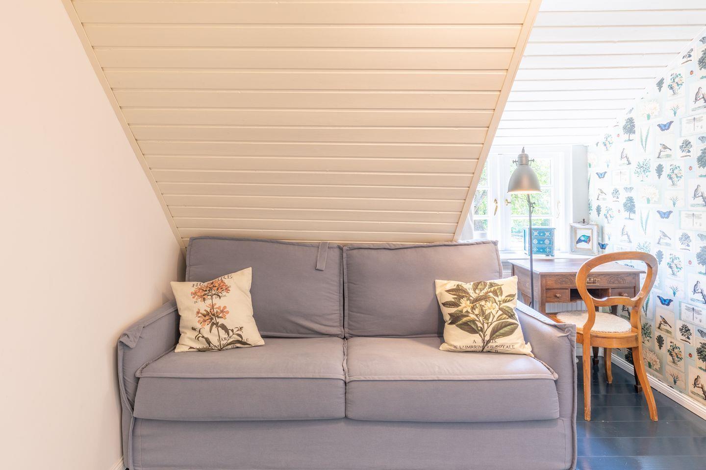Über eine Treppe erreichen Sie das zweite, großzügige Schlafzimmer mit einem Doppelbett (180 x 200) und einer chilligen Rückzugsecke am Fenster mit grandiosem Ausblick in die Natur. Das Duschbad rundet das Bild ab. Bettwäsche und Handtücher (Erstausstattung) werden für Sie bereitgelegt.