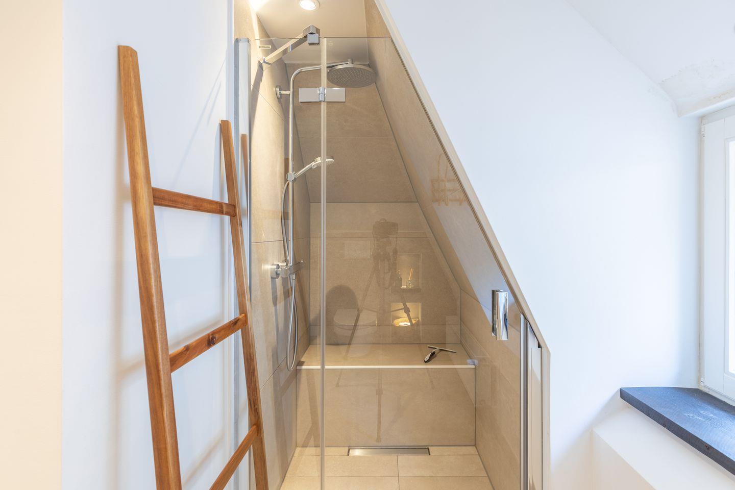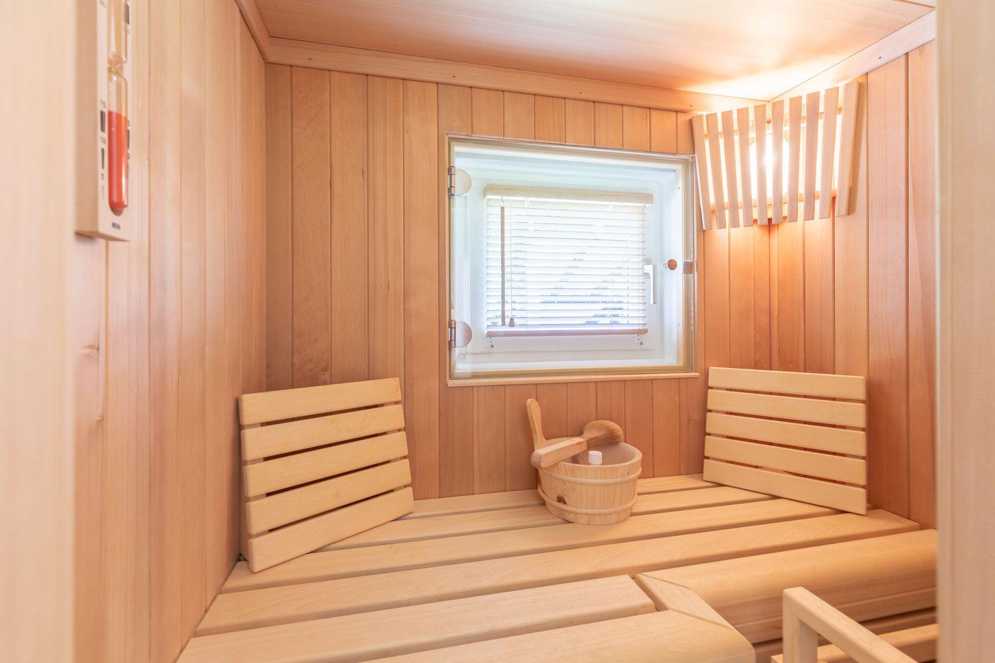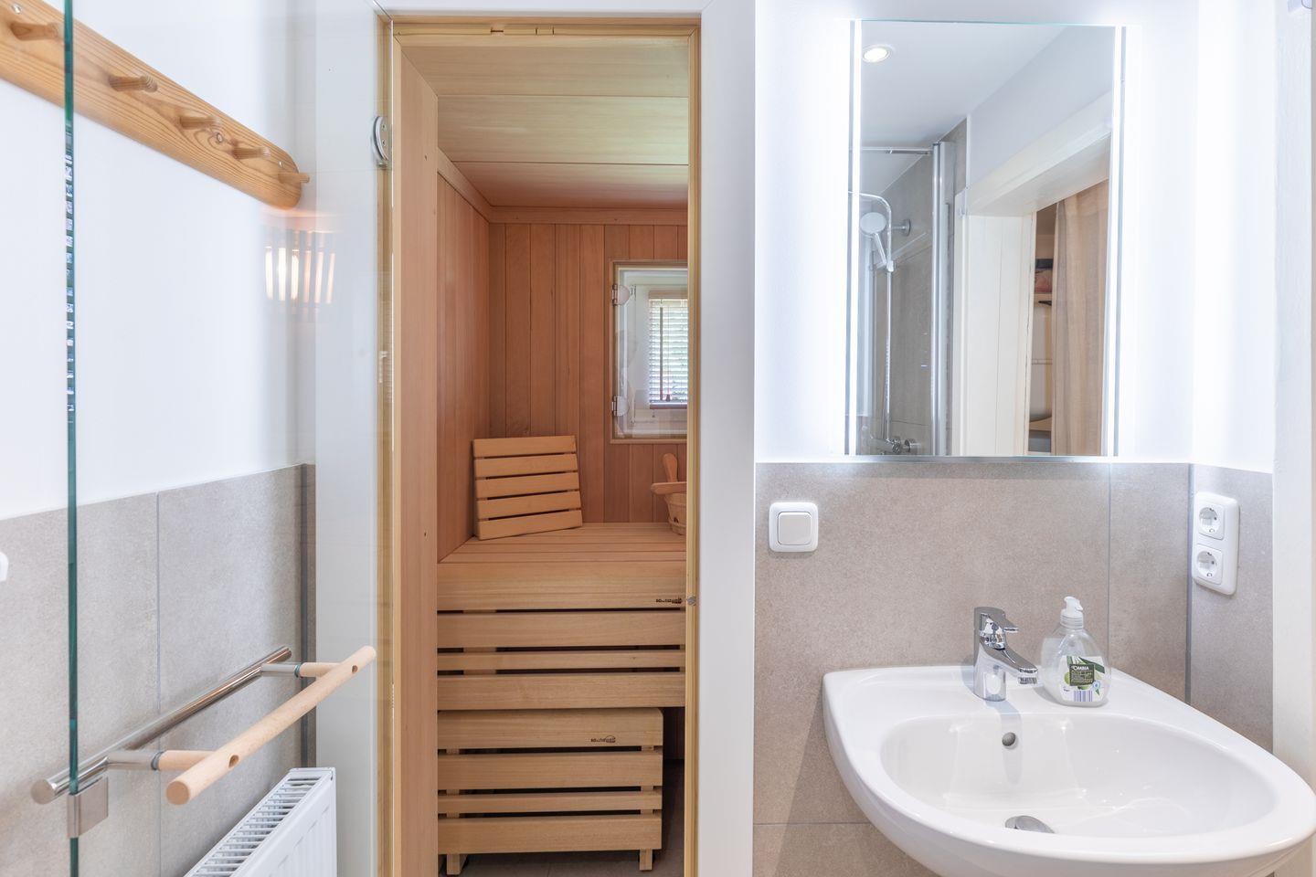 Das Duschbad wird gekrönt mit einer kleinen 2-Personen-Sauna.