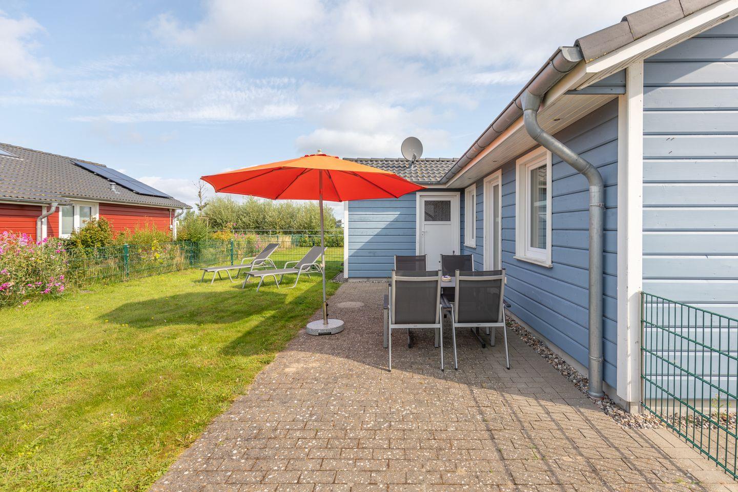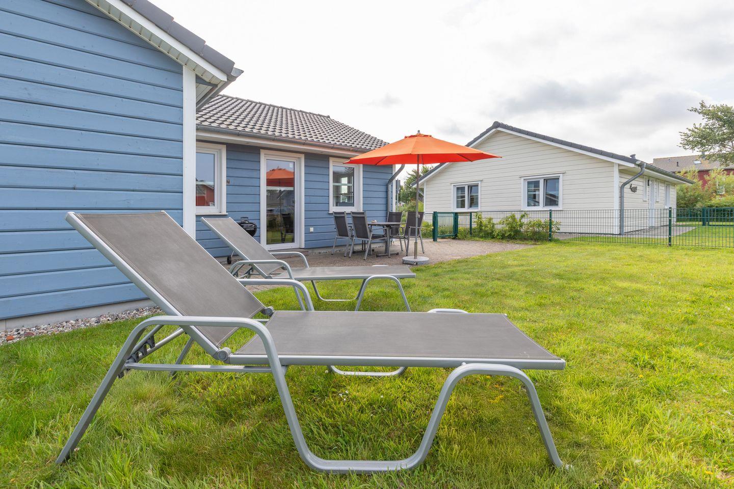Auf der überdachten Terrasse mit Sichtschutz zum Nachbarhaus können Sie auf bequemen Gartenstühlen und -liegen die Sonne genießen.