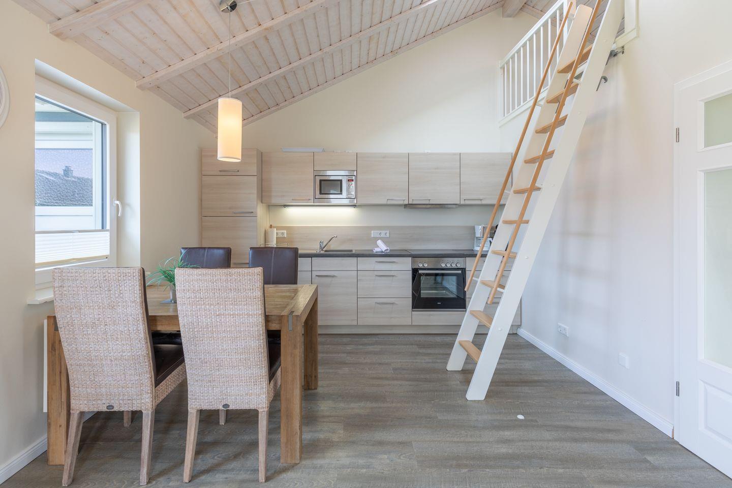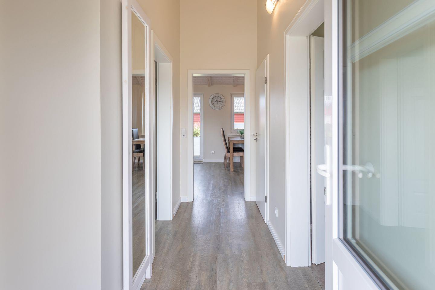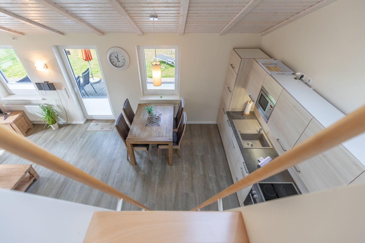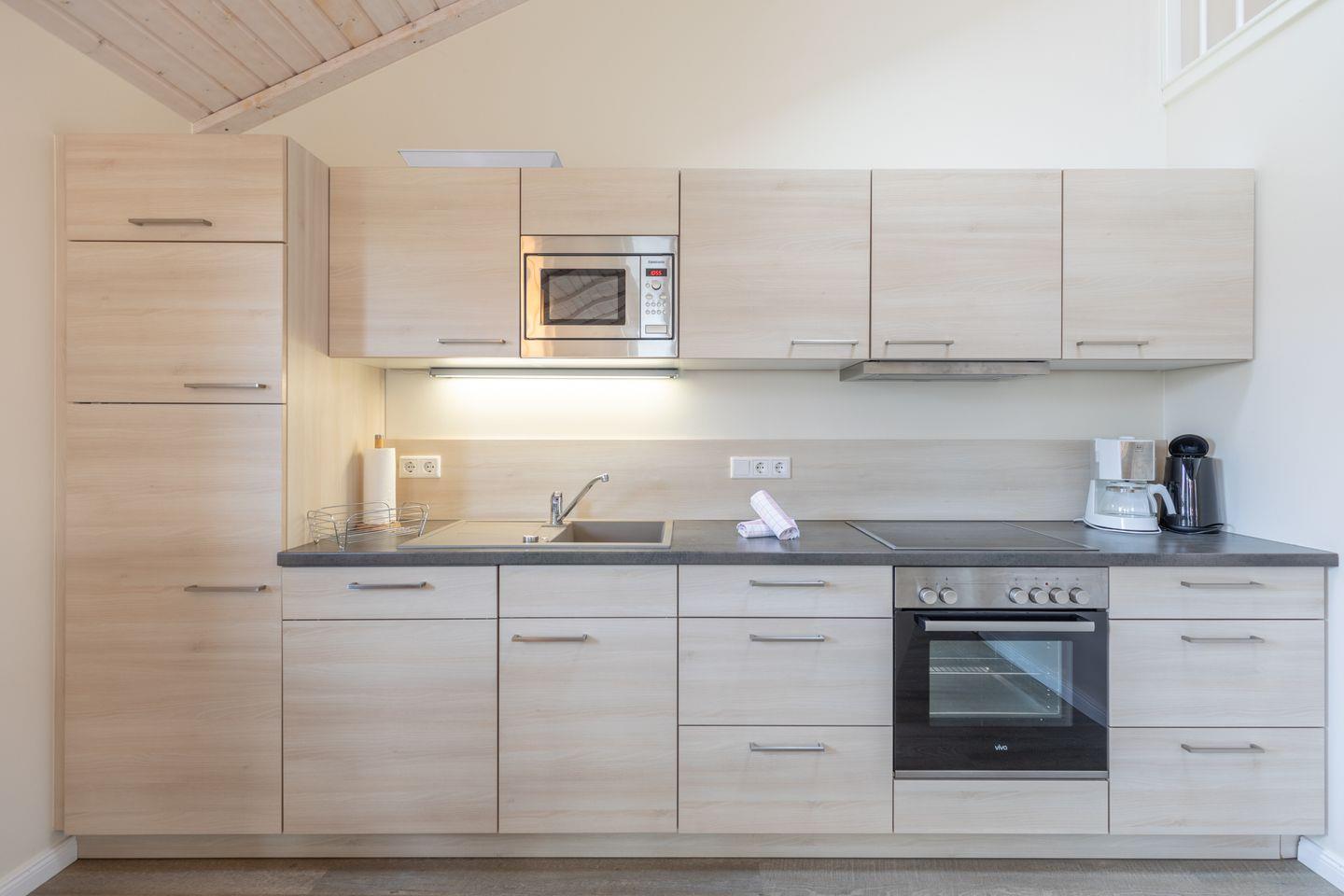 Das 50 qm große Ferienhaus ist modern und exklusiv im skandinavischen Charme eingerichtet. Das Schlafzimmer mit jeweils einem Komfort-Doppelbett (180 x 200 cm) das gemütliche Wohnzimmer sind mit SAT-TV und einer gemütlichen Sofaecke ausgestattet. Die offene Küche bietet Ihnen eine exklusive und umfangreiche Ausstattung, die das Herz eines jeden Hobbykochs höher schlagen lässt: Ceranfeld mit 4 Kochplatten, Backofen, Kühlschrank mit ***Gefrierfach, Mikrowelle, Geschirrspüler, Filterkaffeemaschine uvm.