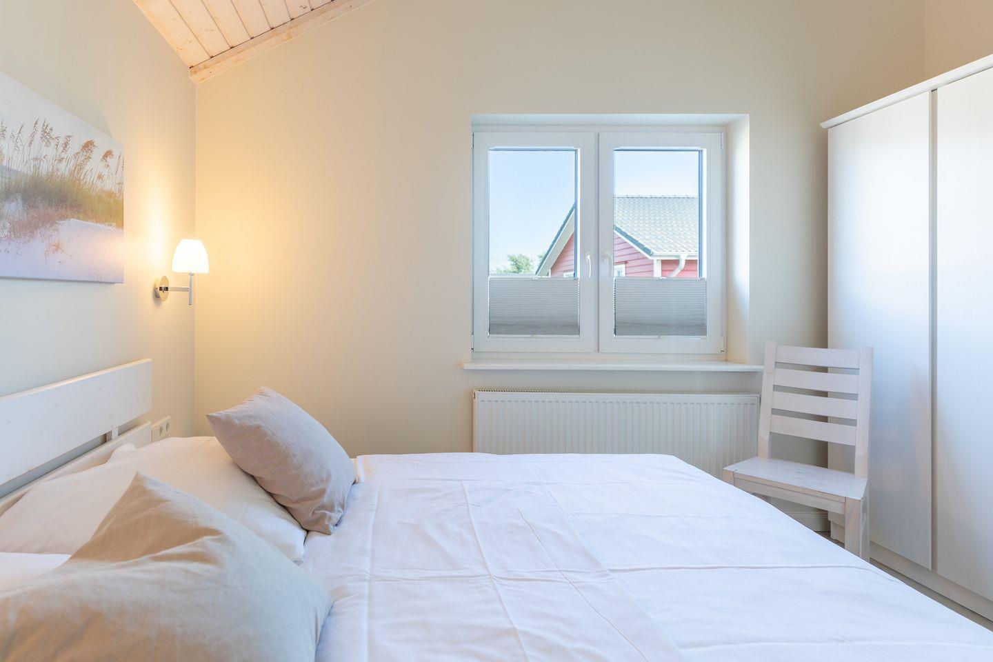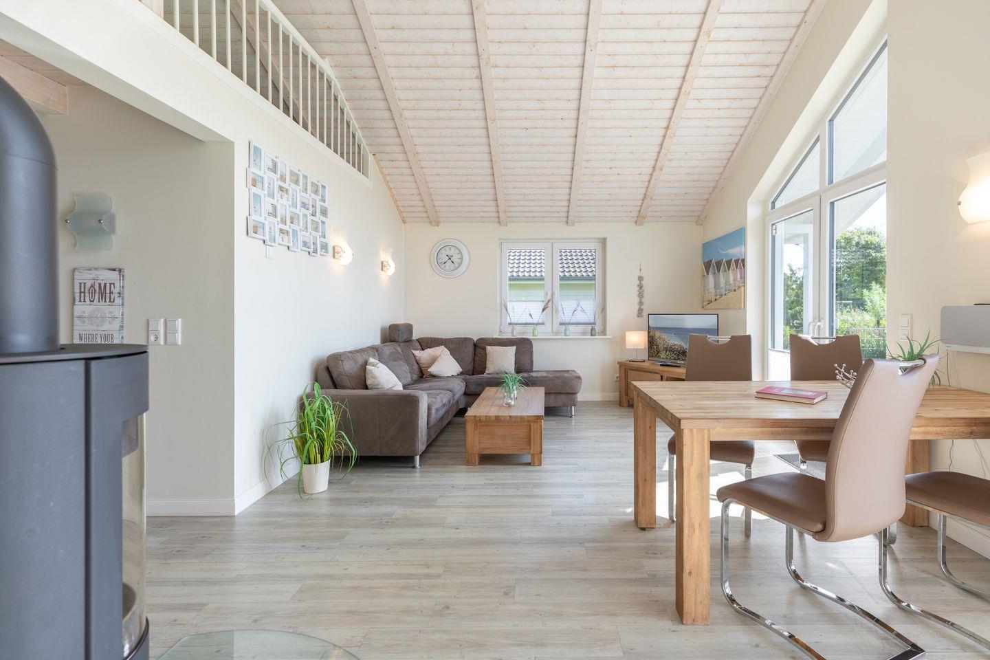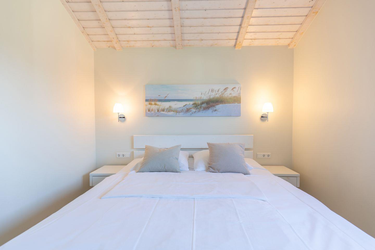 Das 85 qm große Ferienhaus ist modern und exklusiv im skandinavischen Charme eingerichtet. Die zwei Schlafzimmer mit jeweils einem Komfort-Doppelbett (180 × 200 cm) bieten Platz für bis zu vier Personen. Das gemütliche Wohnzimmer ist mit SAT-TV ausgestattet. Der Kaminofen sorgt auch in der kälteren Jahreszeit für behagliche Stunden. Die offene Küche bietet Ihnen eine exklusive und umfangreiche Ausstattung, die das Herz eines jeden Hobbykochs höher schlagen lässt: Ceranfeld mit 4 Kochplatten, Backofen, Kühlschrank mit ***Gefrierfach, Mikrowelle, Geschirrspüler, Filterkaffeemaschine u. v. m. Das Badezimmer lässt keine Wünsche offen: zwei Waschbecken, eine große Badewanne, eine ebenerdige Dusche und eine schöne Sauna geben Ihrem Urlaub den richtigen Rahmen. Das Ferienhaus verfügt über ein zusätzliches WC. Auf der überdachten Terrasse können Sie auf bequemen Gartenstühlen und -liegen die Sonne genießen.