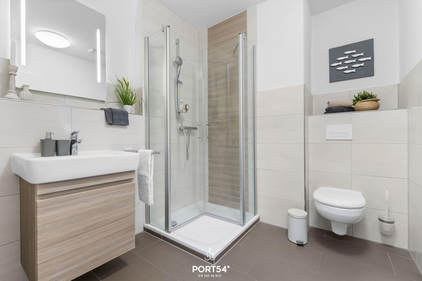 Die Wohnung überzeugt durch ihre helle und freundliche Atmosphäre. Große Oberlichtfenster lassen viel Tageslicht herein und schaffen ein angenehmes Wohngefühl. Der offene Wohn- und Küchenbereich ist modern gestaltet und perfekt geeignet für Selbstversorger und entspannte Abende. Das moderne Badezimmer mit Dusche bietet zusätzlichen Komfort und eine hochwertige Ausstattung.