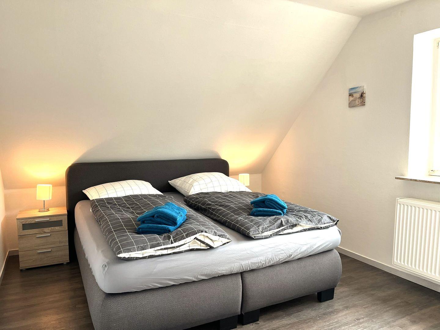 Zwei großzügige Schlafzimmer mit bequemen Boxspringbetten (180x200)