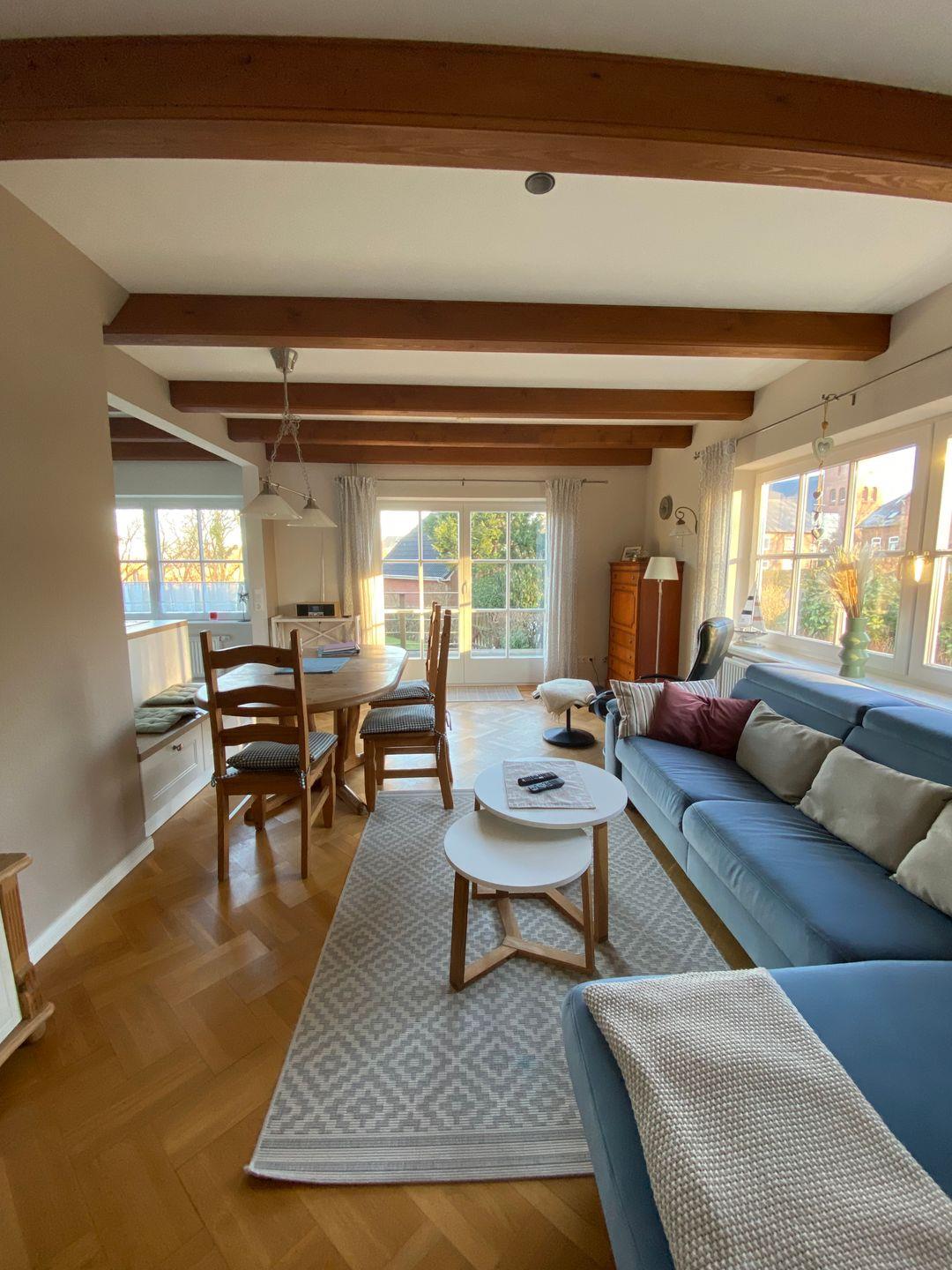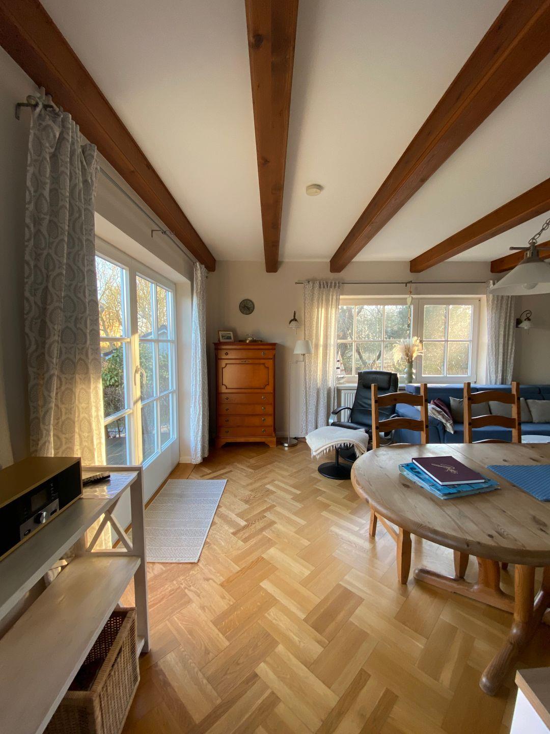 Genießen Sie die frische Luft auf der Terrasse, die mit Gartenmöbeln einem Sonnenschirm und einem Strandkorb ausgestattet ist. Hier können Sie entspannen, während die Kinder im angrenzenden Garten mit Sandkasten und Schaukel spielen. Der Garten bietet zudem eine ruhige Oase mit Sonnenliegen, sodass Sie auch während Ihres Aufenthalts die Natur in vollen Zügen auskosten können. Zudem ist das Haus eine Nichtraucherunterkunft – für ein gesundes Wohnklima.