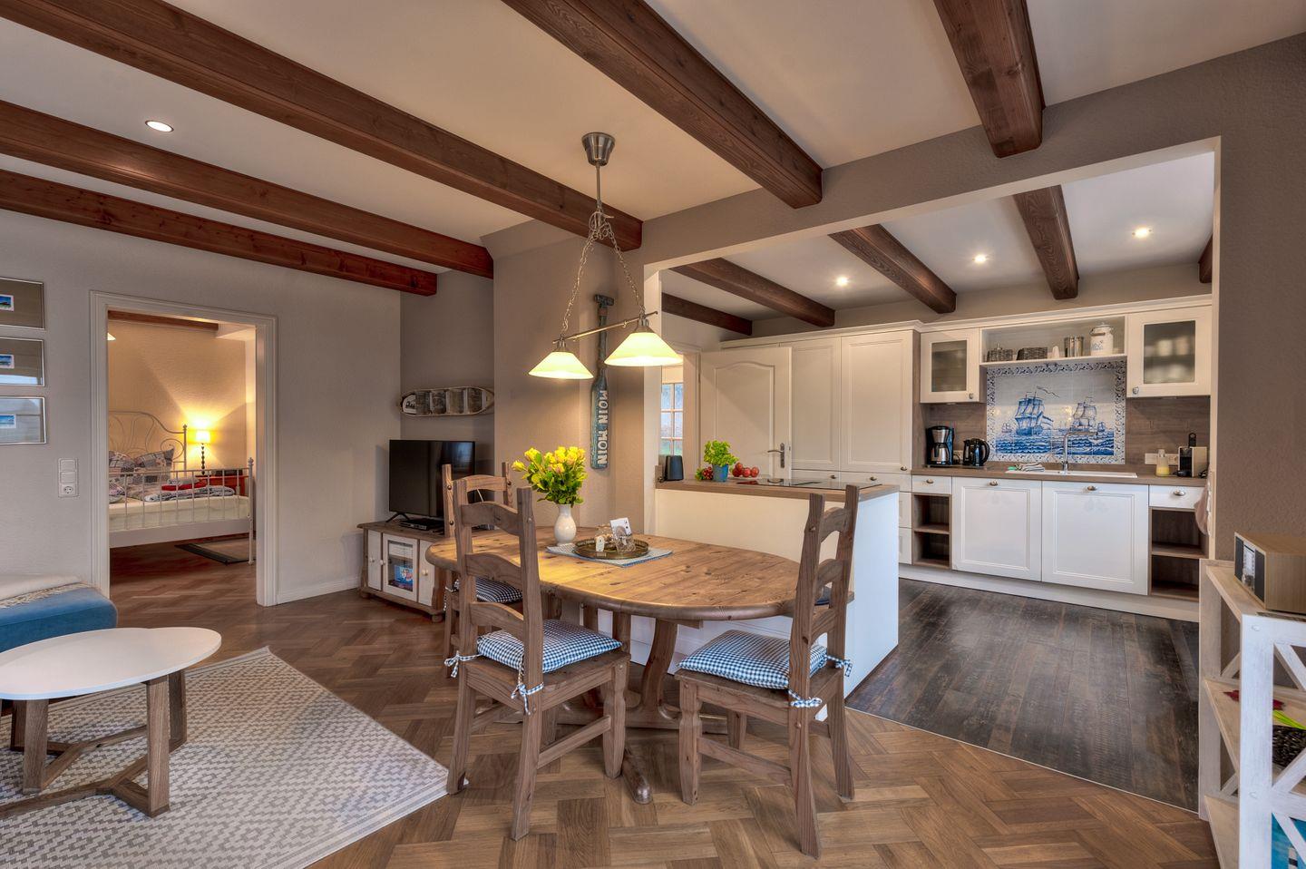 Das helle und einladende Wohnzimmer lädt zum Entspannen ein. Hier können Sie die Abende beim Fernsehen oder mit Gesellschaftsspielen verbringen. Die offene, moderne Küche mit Essbereich ist komplett ausgestattet und bietet alles, was Sie für die Zubereitung köstlicher Mahlzeiten benötigen, einschließlich einer Spülmaschine und Mikrowelle. Der Essbereich ist perfekt für gesellige Abendessen mit der Familie oder Freunden.