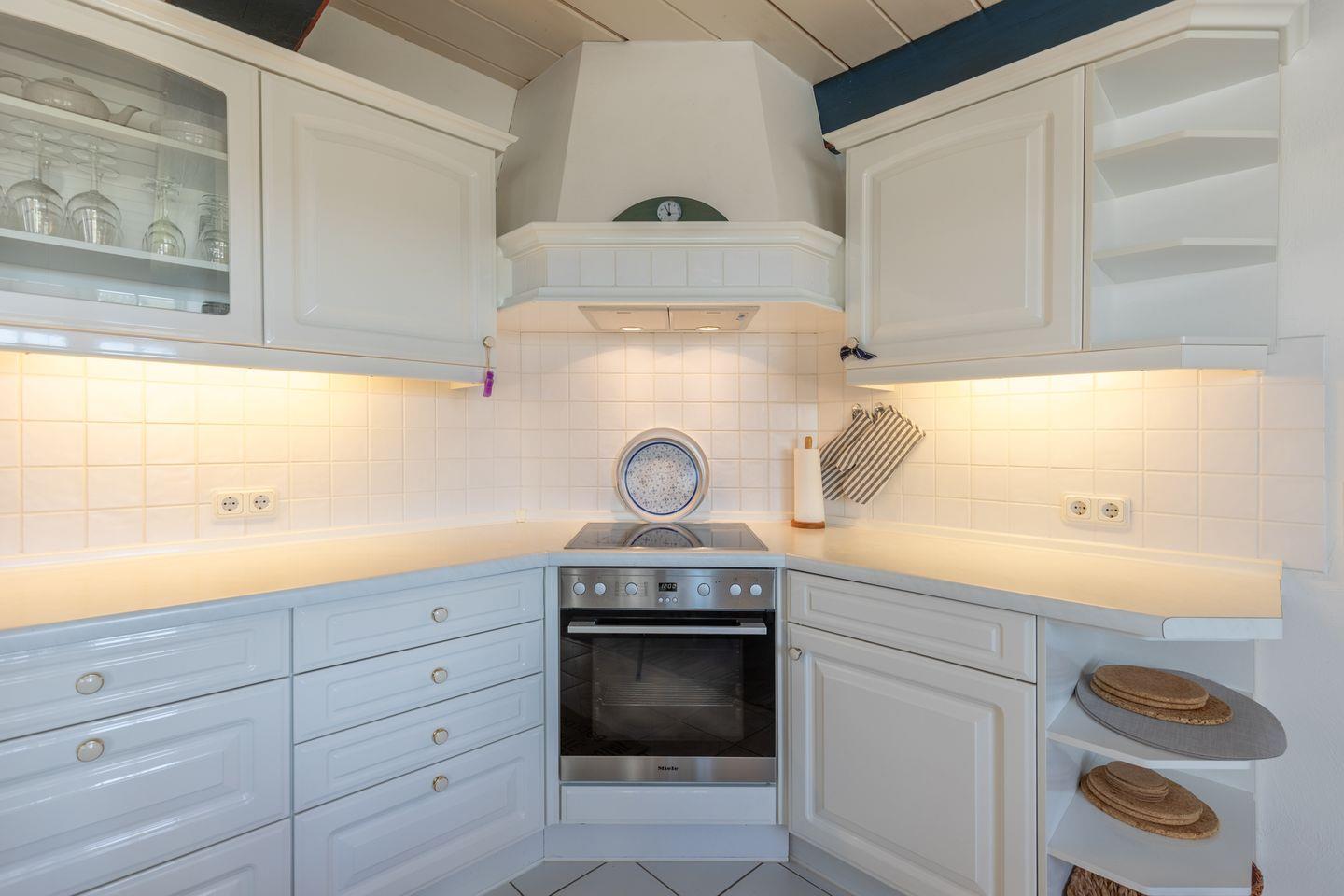 Die offene Küche mit Essbereich ist mit einem Geschirrspüler, einem Ceranfeld, einer Kaffeemaschine und einem Kühlschrank ausgestattet. Ein separater Vorratsraum bietet zusätzlichen Stauraum und beherbergt einen Gasgrill, eine Waschmaschine und einen Wäschetrockner.