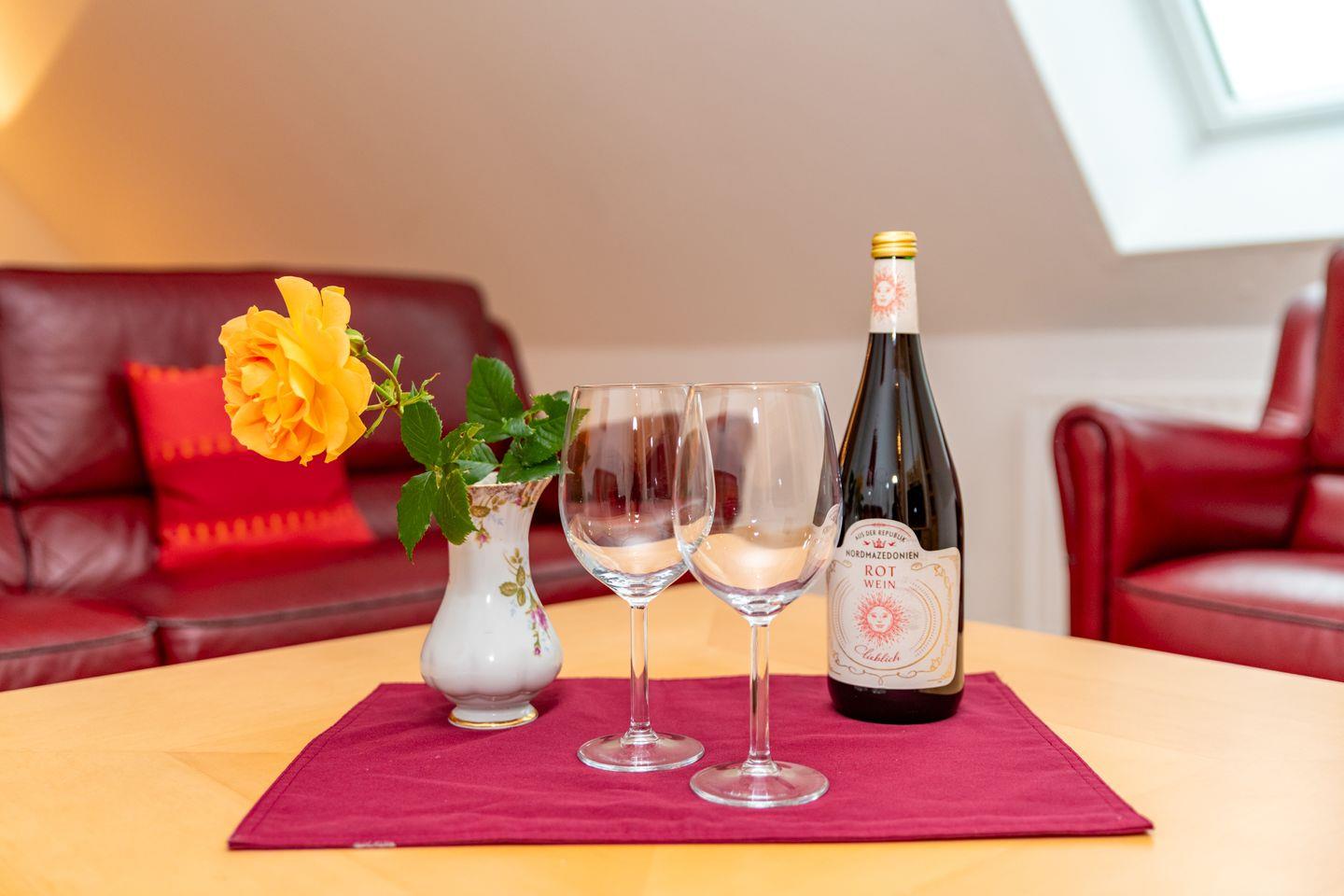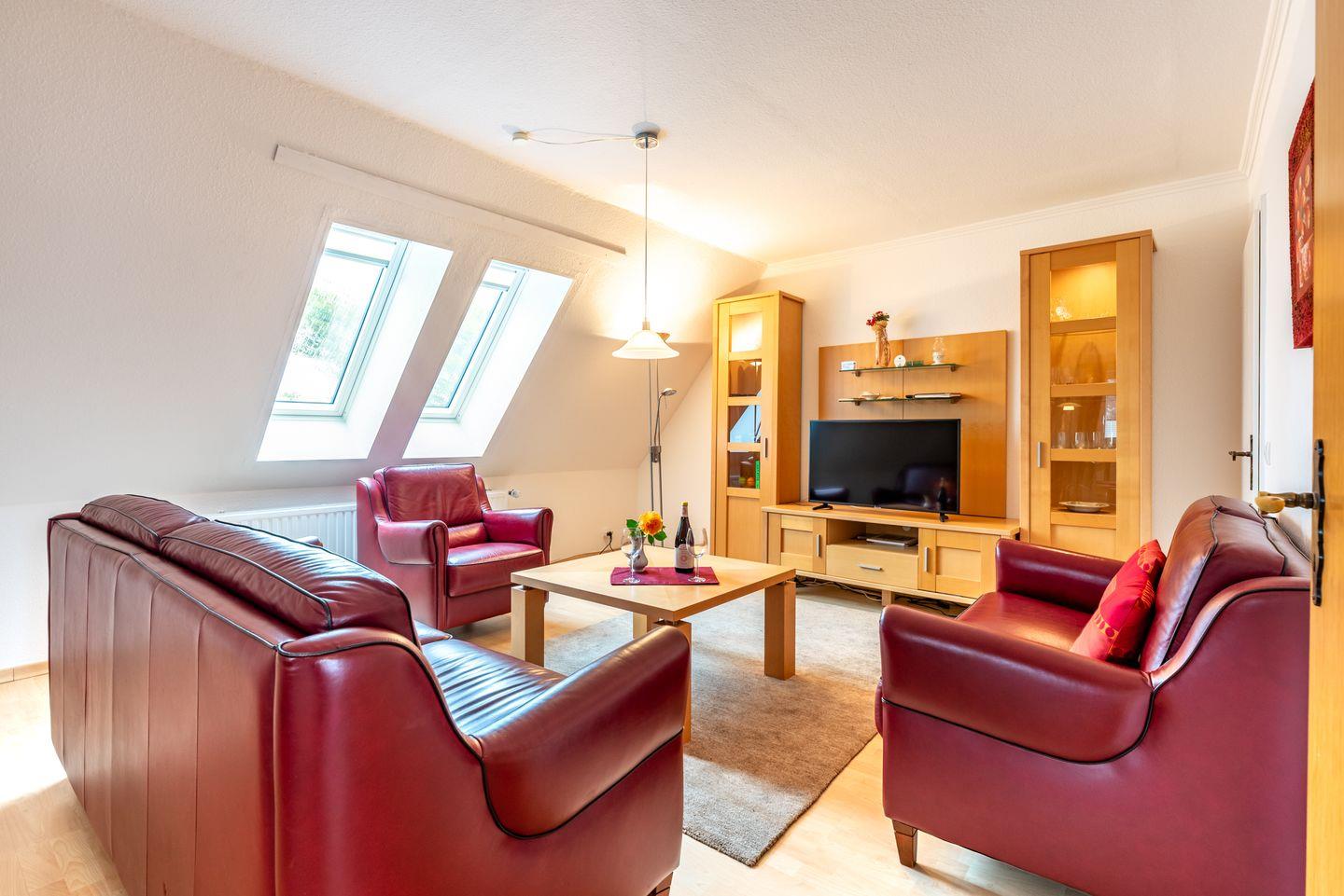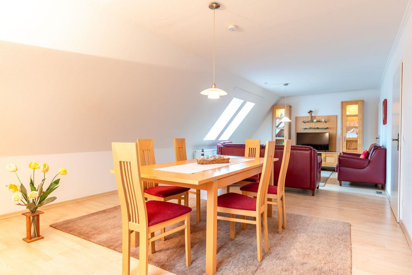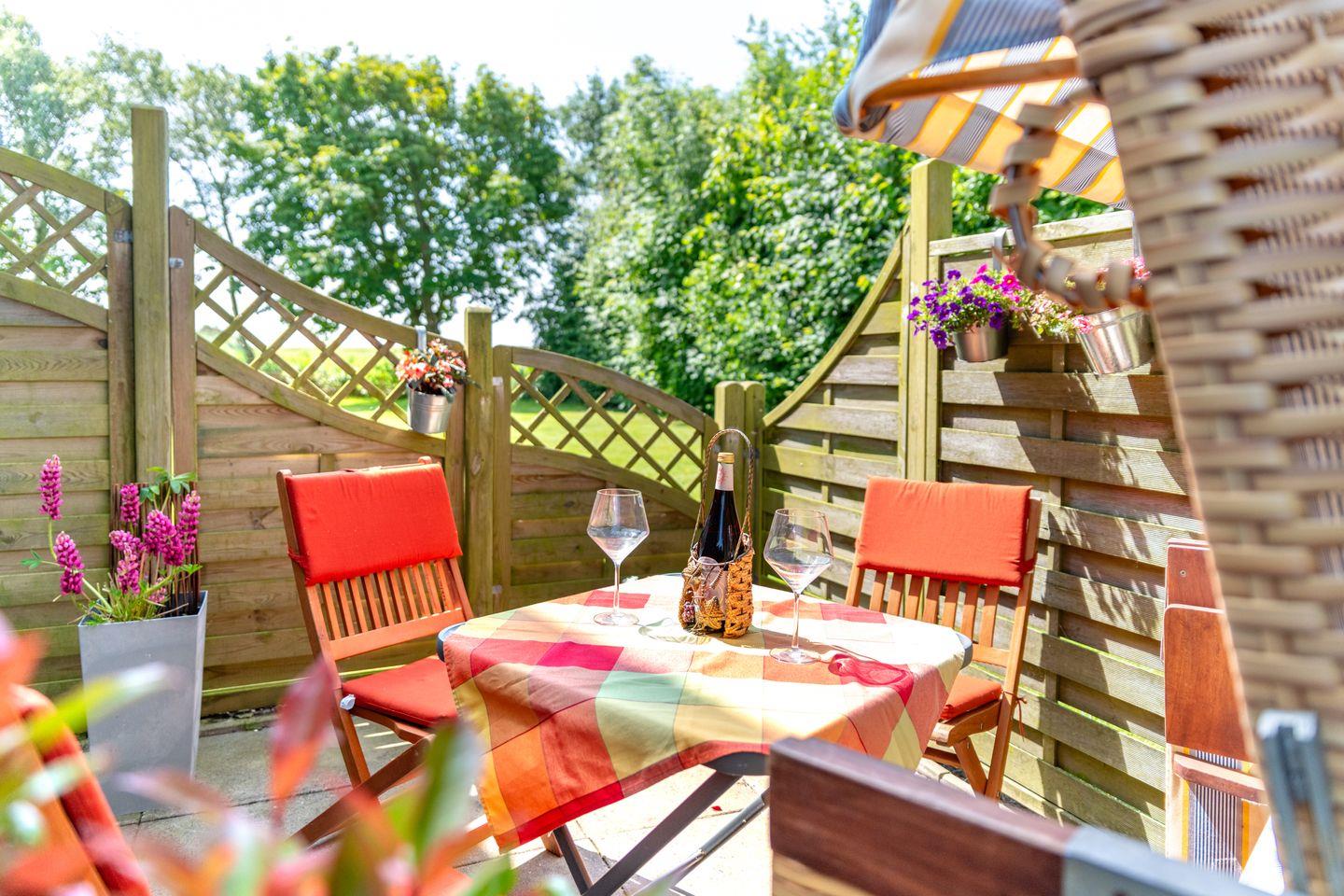 Ihre Ferienwohnung liegt in der 1. Etage und ist über einen separaten Eingang zu erreichen. Außerdem haben Sie eine eigene, windgeschützte Terrasse, ausgestattet mit Gartenmöbeln, Holzkohlegrill und einem Strandkorb. Genießen Sie hier die Sonne, lesen Sie ein gutes Buch oder planen Sie Ihren nächsten Ausflug in die Umgebung. Der Sichtschutz sorgt dafür, dass Sie ungestört in privater Atmosphäre die Idylle Ihres Urlaubs genießen können.