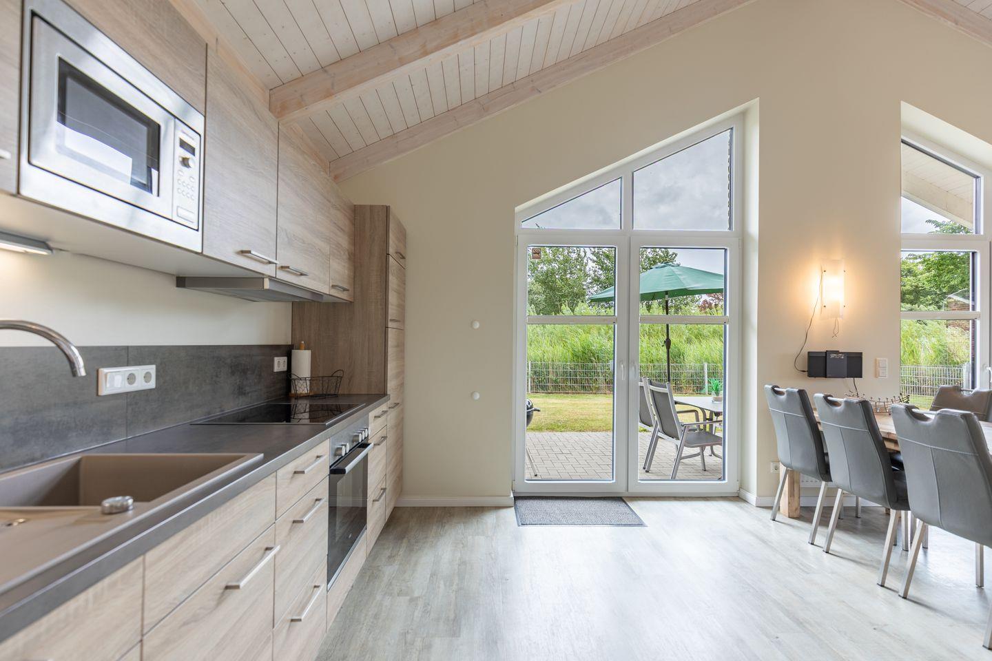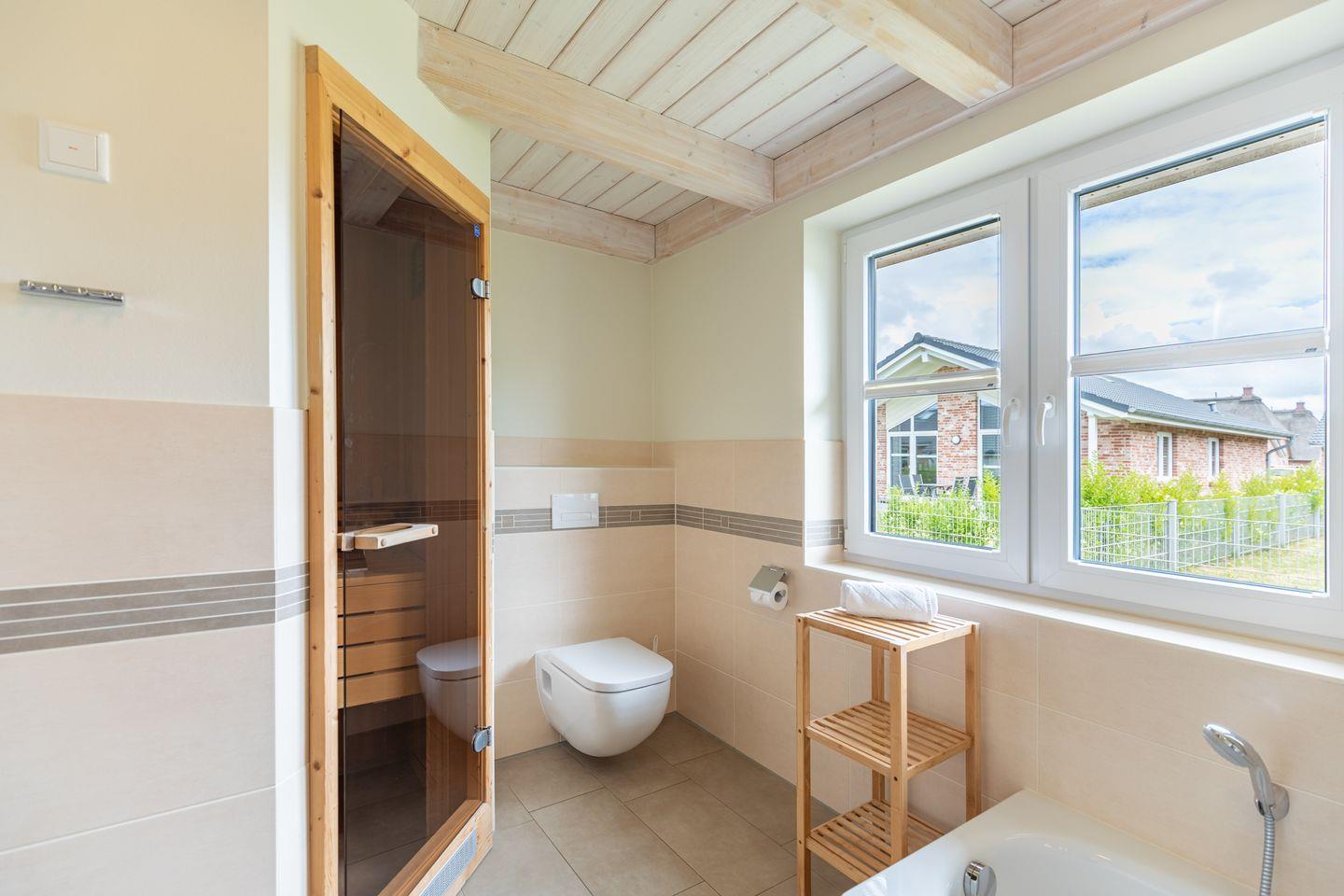 Das gemütliche Wohnzimmer ist mit SAT-TV ausgestattet. Der Kaminofen sorgt auch in der kälteren Jahreszeit für behagliche Stunden. Die offene Küche bietet Ihnen eine exklusive und umfangreiche Ausstattung, die das Herz eines jeden Hobbykochs höher schlagen lässt: Ceranfeld mit 4 Kochplatten, Backofen, Kühlschrank mit ***Gefrierfach, Mikrowelle, Geschirrspüler, Filterkaffeemaschine uvm. Das Badezimmer lässt keine Wünsche offen: zwei Waschbecken, eine große Badewanne, eine ebenerdige Dusche und eine schöne Sauna geben Ihrem Urlaub den richtigen Rahmen. Das Ferienhaus verfügt über ein zusätzliches WC. Auf der überdachten Terrasse können Sie auf bequemen Gartenstühlen und -liegen die Sonne genießen.