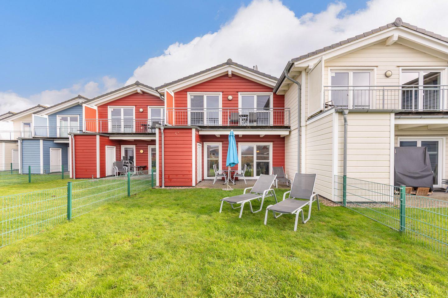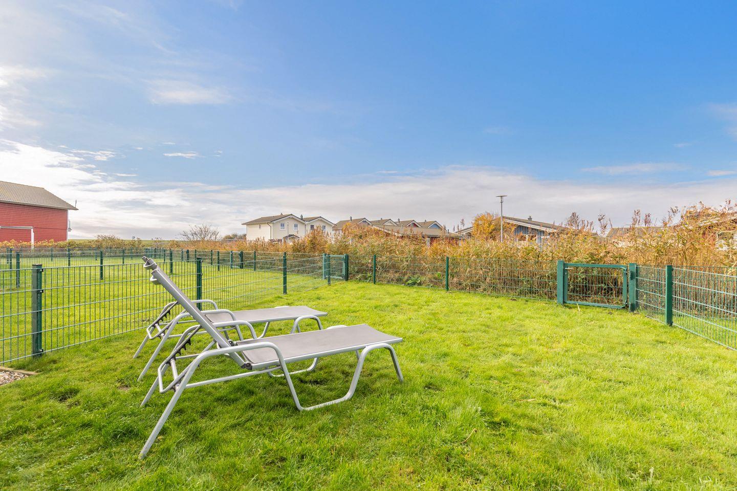 Auf der sonnigen Terrasse können Sie auf bequemen Gartenstühlen, im Strandkorb und auf Sonnenliegen die Sonne genießen. Der Garten ist umzäunt.