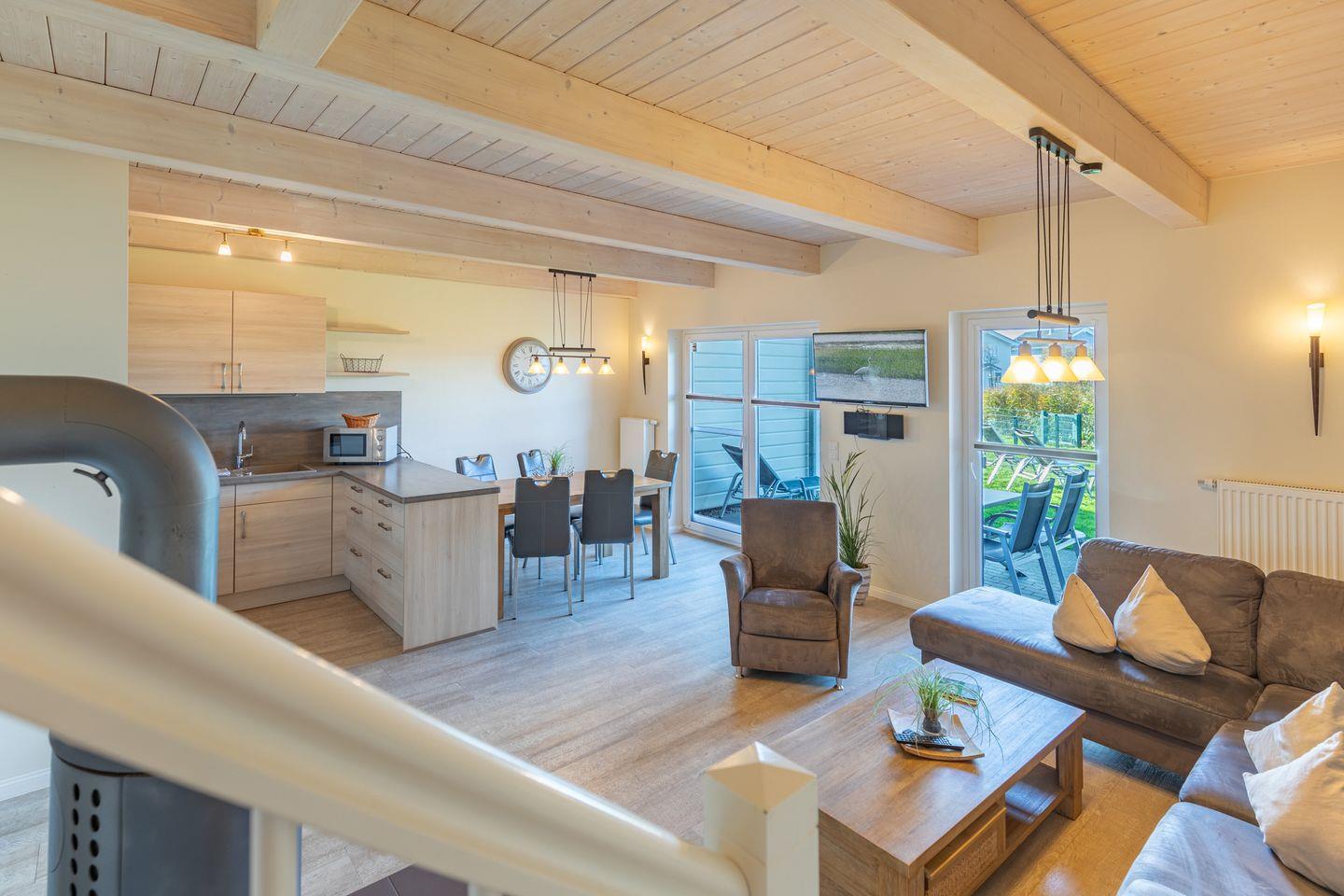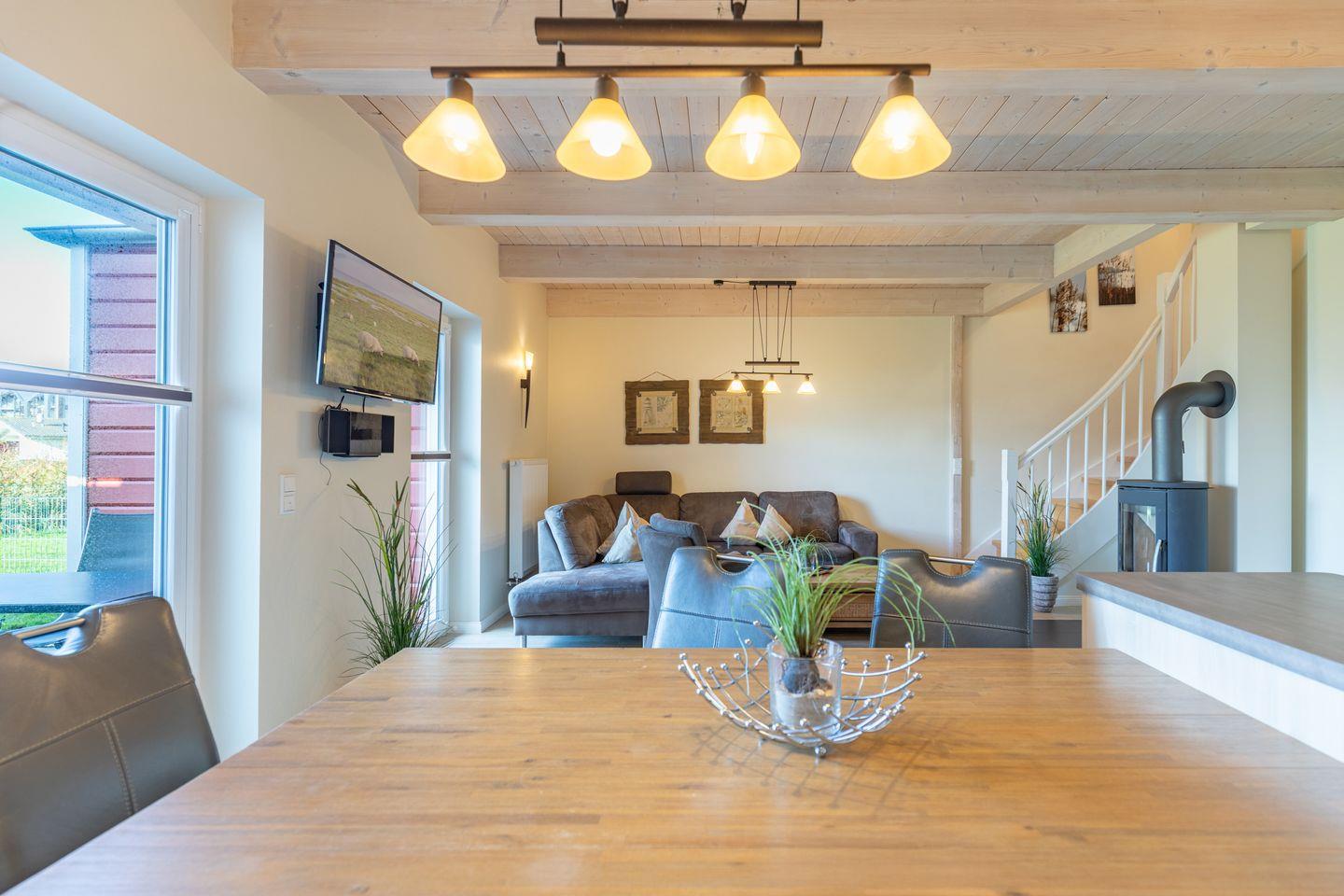 Das gemütliche Wohnzimmer ist mit SAT-TV ausgestattet. Der Kaminofen sorgt auch in der kälteren Jahreszeit für behagliche Stunden. Die offene Küche bietet Ihnen eine exklusive und umfangreiche Ausstattung, die das Herz eines jeden Hobbykochs höher schlagen lässt: Ceranfeld mit 4 Kochplatten, Backofen, Kühlschrank mit ***Gefrierfach, Mikrowelle, Geschirrspüler, Filterkaffeemaschine uvm.