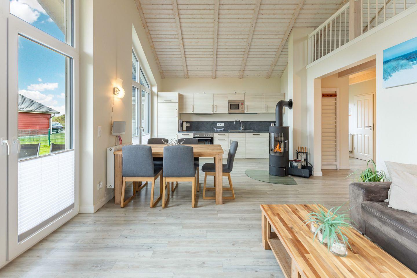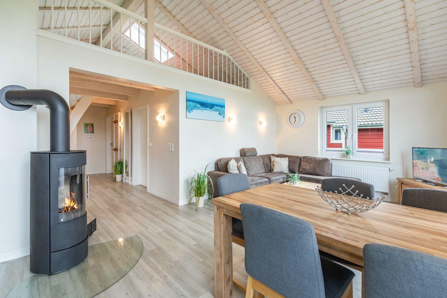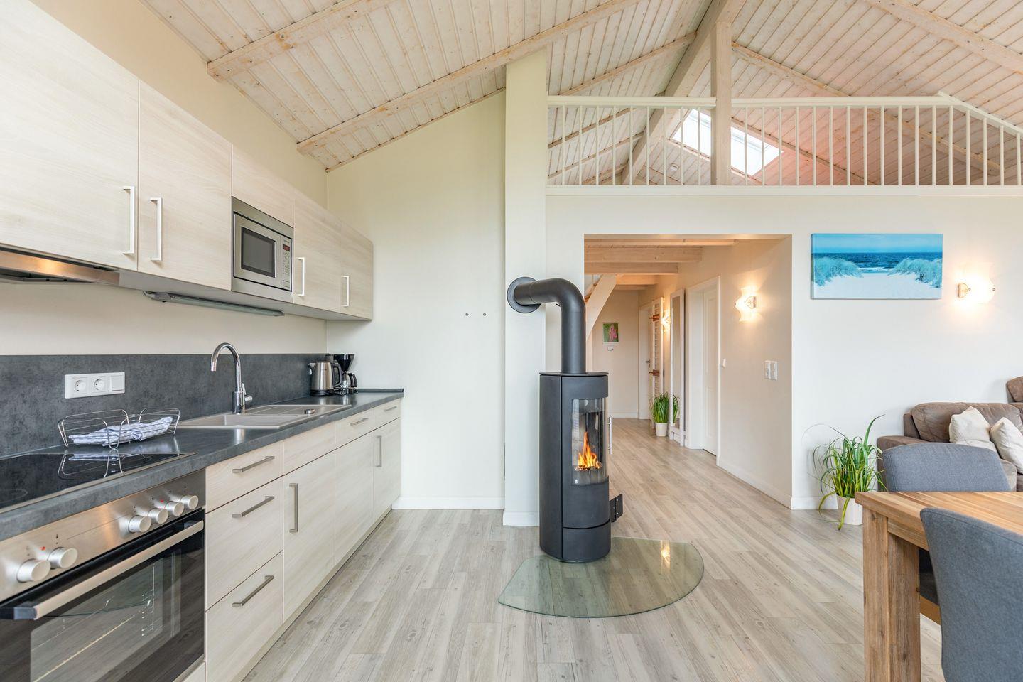 Das gemütliche Wohnzimmer ist mit einem SAT-TV ausgestattet. Der Kaminofen sorgt auch in der kälteren Jahreszeit für behagliche Stunden. Die offene Küche bietet Ihnen eine exklusive und umfangreiche Ausstattung, die das Herz eines jeden Hobbykochs höher schlagen lässt: Ceranfeld mit 4 Kochplatten, Backofen, Kühlschrank mit ***Gefrierfach, Mikrowelle, Geschirrspüler, Filterkaffeemaschine uvm. Das Badezimmer lässt keine Wünsche offen: zwei Waschbecken, eine große Badewanne, eine ebenerdige Dusche und eine schöne Sauna geben Ihrem Urlaub den richtigen Rahmen. Das Ferienhaus verfügt über ein zusätzliches WC. Auf der überdachten Terrasse können Sie auf bequemen Gartenstühlen und -liegen die Sonne genießen. In den Monaten von April bis Oktober steht Ihnen zusätzlich ein Strandkorb zur Verfügung.