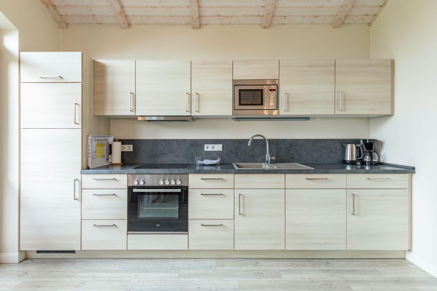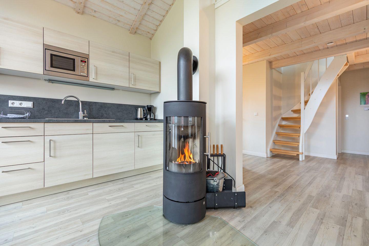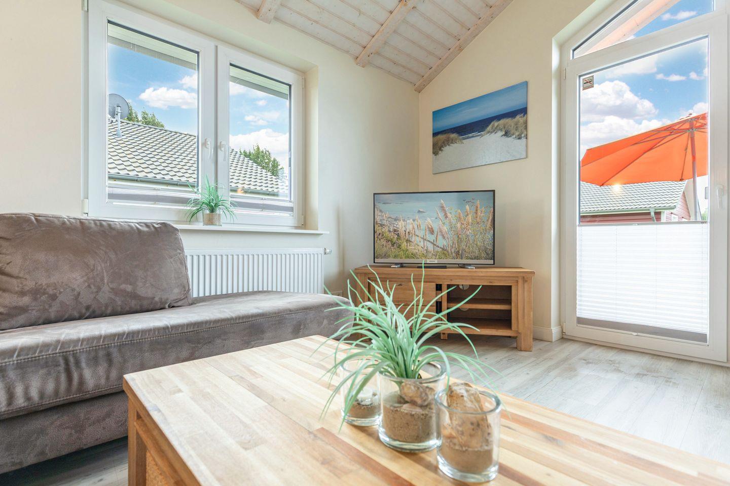 Das gemütliche Wohnzimmer ist mit einem SAT-TV ausgestattet. Der Kaminofen sorgt auch in der kälteren Jahreszeit für behagliche Stunden. Die offene Küche bietet Ihnen eine exklusive und umfangreiche Ausstattung, die das Herz eines jeden Hobbykochs höher schlagen lässt: Ceranfeld mit 4 Kochplatten, Backofen, Kühlschrank mit ***Gefrierfach, Mikrowelle, Geschirrspüler, Filterkaffeemaschine uvm. Das Badezimmer lässt keine Wünsche offen: zwei Waschbecken, eine große Badewanne, eine ebenerdige Dusche und eine schöne Sauna geben Ihrem Urlaub den richtigen Rahmen. Das Ferienhaus verfügt über ein zusätzliches WC. Auf der überdachten Terrasse können Sie auf bequemen Gartenstühlen und -liegen die Sonne genießen. In den Monaten von April bis Oktober steht Ihnen zusätzlich ein Strandkorb zur Verfügung.