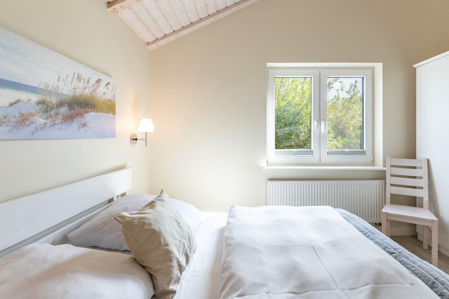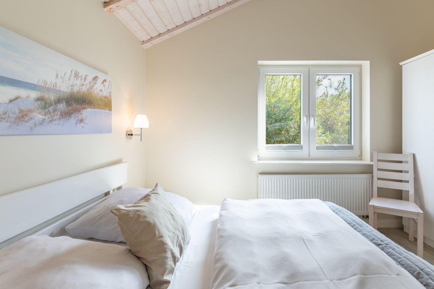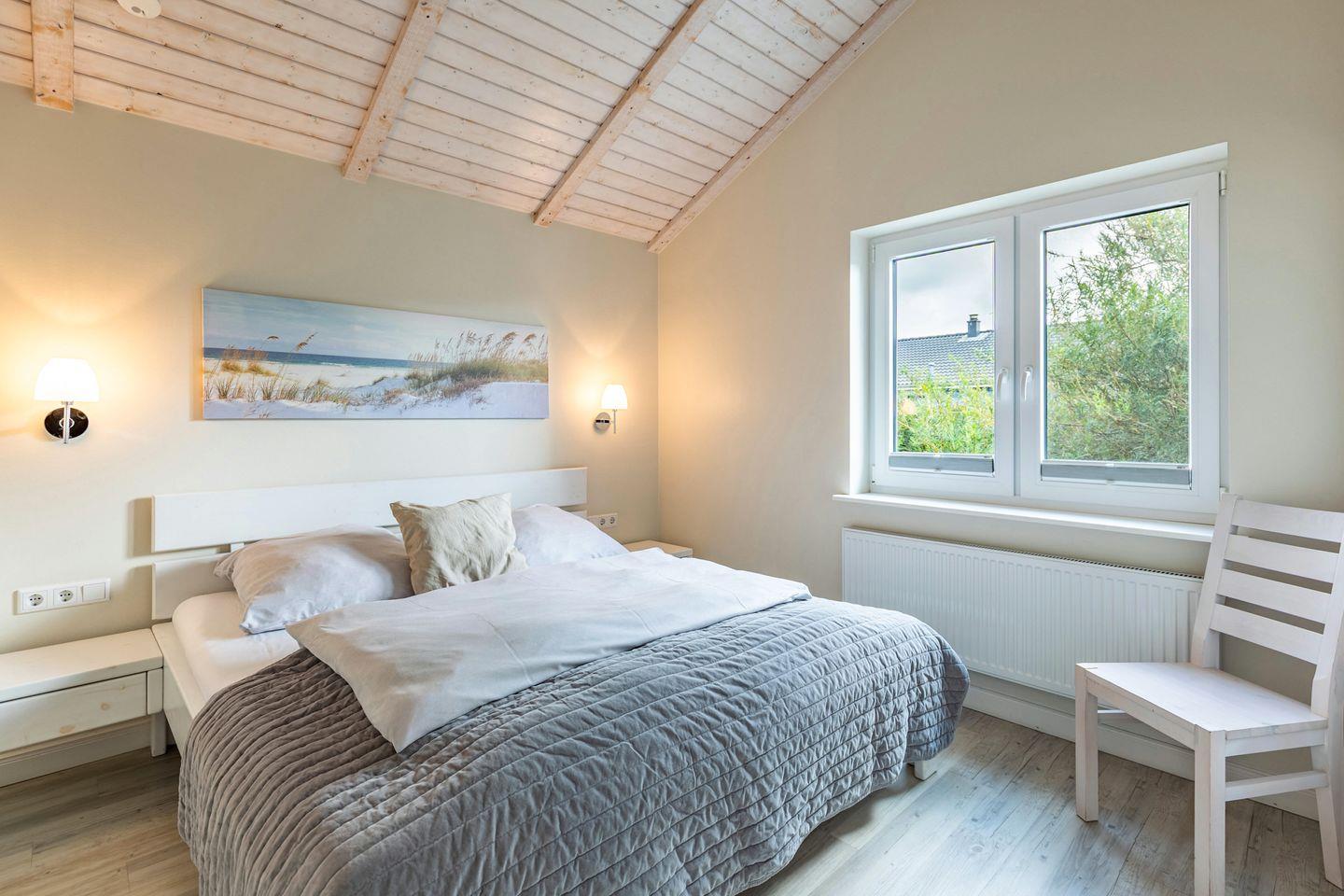 Das 80 qm große Ferienhaus ist modern und exklusiv im skandinavischen Charme eingerichtet. Die zwei Schlafzimmer mit jeweils einen Komfort-Doppelbett (180 x 200 cm) bieten Platz für bis zu vier Personen. Die Schlafzimmer sind mit Fliegengittern ausgestattet.