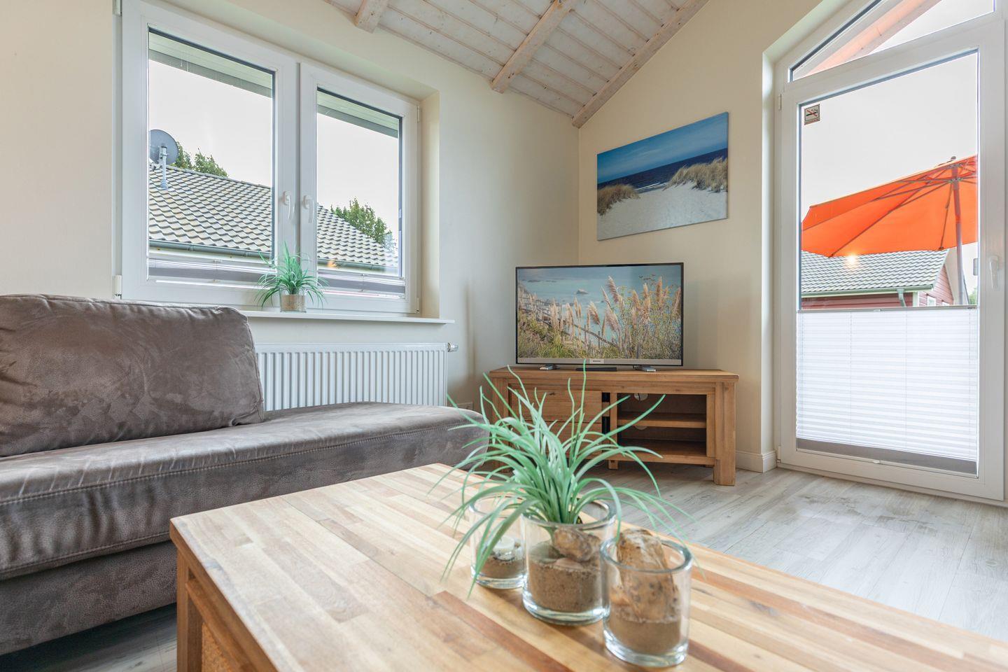 Das gemütliche Wohnzimmer ist mit SAT-TV und einem Blu-Ray-DVD-Player ausgestattet. Der Kaminofen sorgt auch in der kälteren Jahreszeit für behagliche Stunden. Die offene Küche bietet Ihnen eine exklusive und umfangreiche Ausstattung, die das Herz eines jeden Hobbykochs höher schlagen lässt: Ceranfeld mit 4 Kochplatten, Backofen, Kühlschrank mit ***Gefrierfach, Mikrowelle, Geschirrspüler, Filterkaffeemaschine uvm. Das Badezimmer lässt keine Wünsche offen: zwei Waschbecken, eine große Badewanne, eine ebenerdige Dusche und eine schöne Sauna geben Ihrem Urlaub den richtigen Rahmen. Das Ferienhaus verfügt über ein zusätzliches WC. Auf der überdachten Terrasse können Sie auf bequemen Gartenstühlen und -liegen die Sonne genießen. In den Monaten von April bis Oktober steht Ihnen zusätzlich ein Strandkorb zur Verfügung.
