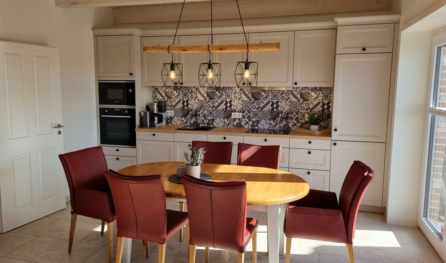 Im offen zum Wohnzimmer gestalteten Küchenbereich erwartet Sie eine hochwertige Ausstattung, die auch anspruchsvolle Selbstversorger überzeugt. Hier finden Sie einen Induktionsherd, einen Elektrobackofen, einen extra Gefrierschrank, Kühlschrank, Spülmaschine, Kaffeemaschine, Wasserkocher, Toaster, Eierkocher, Mixer sowie umfangreiches Geschirr und Besteck. Der angrenzende Essbereich und das gemütliche Sofa laden zu gemeinsamen Mahlzeiten oder entspannten Abenden ein. Für eine behagliche Atmosphäre, auch an kühleren Tagen, sorgt die vorhandene Fußbodenheizung sowie ein Ofen, der dem Wohnraum besonderen Charme verleiht.