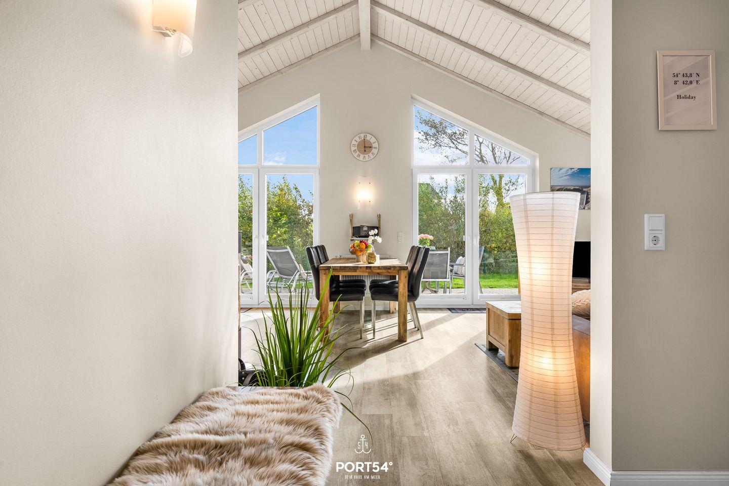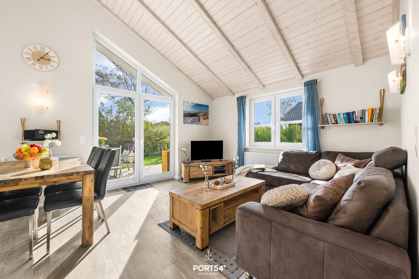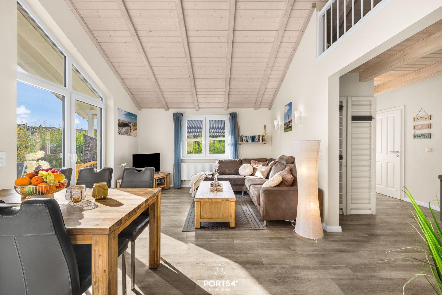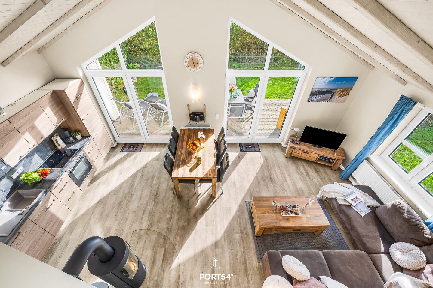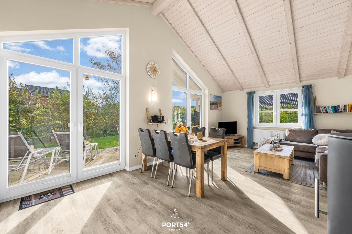 Das Haus empfängt dich mit einem lichtdurchfluteten Wohnbereich im Erdgeschoss. Hier erwarten dich eine gemütliche Sofaecke, ein Essbereich sowie ein Kaminofen, der an kühleren Tagen für eine behagliche Atmosphäre sorgt. Für deine mediale Unterhaltung stehen zwei Fernseher und ein Blu-ray-Spieler zur Verfügung.