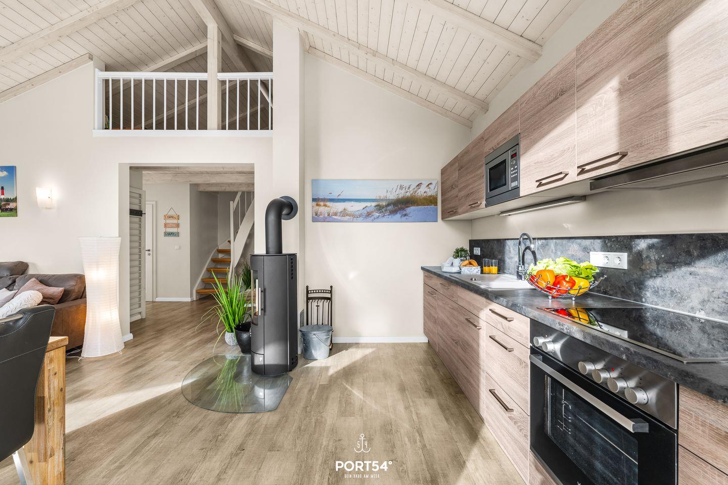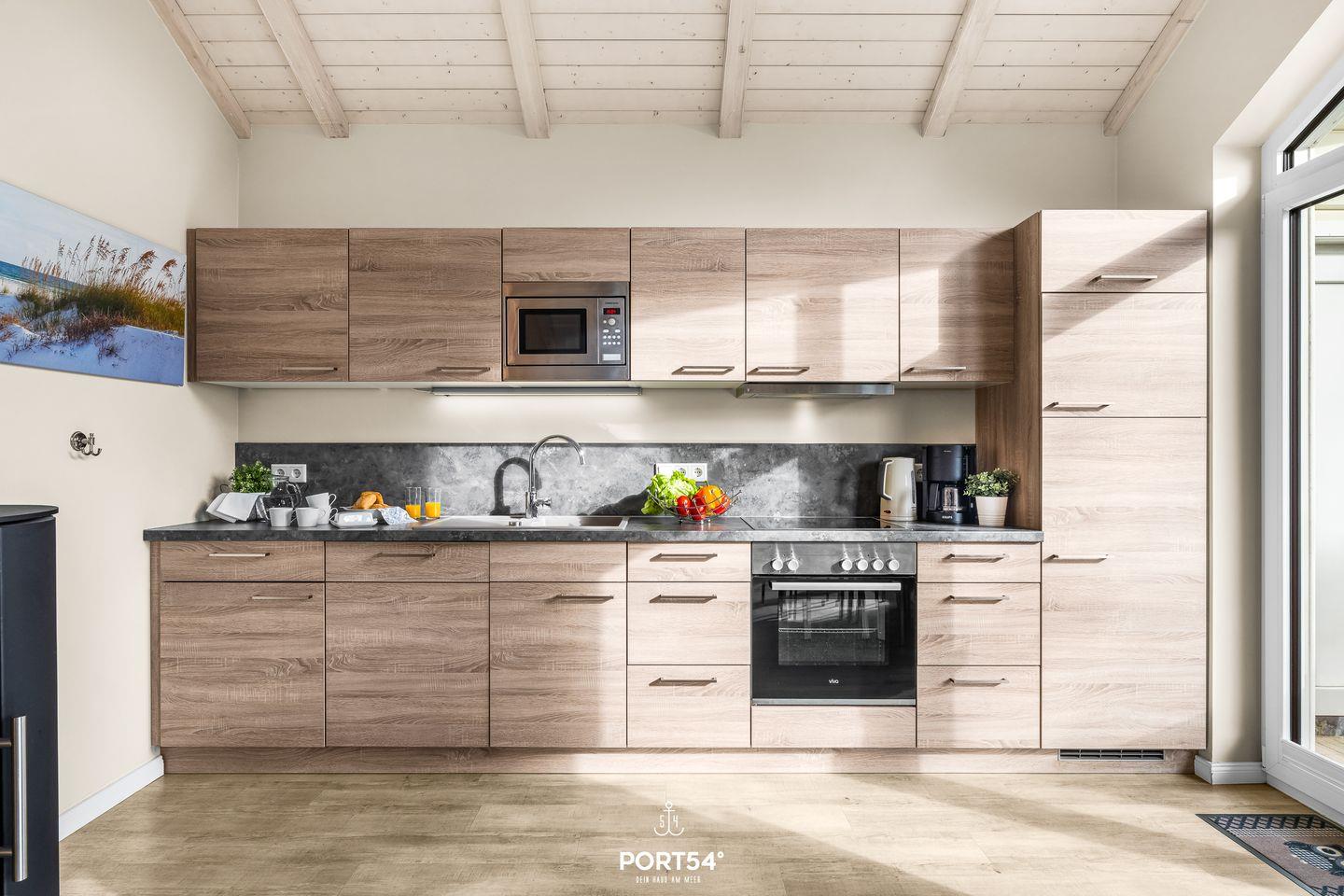 Die offene Küche ist zum Wohnzimmer hin gestaltet und umfassend ausgestattet – moderne Geräte wie Ceranherd, Backofen, Geschirrspüler, Kühlschrank mit Gefrierfach, Mikrowelle, Kaffeemaschine sowie umfangreiches Geschirr und Besteck bieten alles, was du für die Selbstversorgung brauchst.