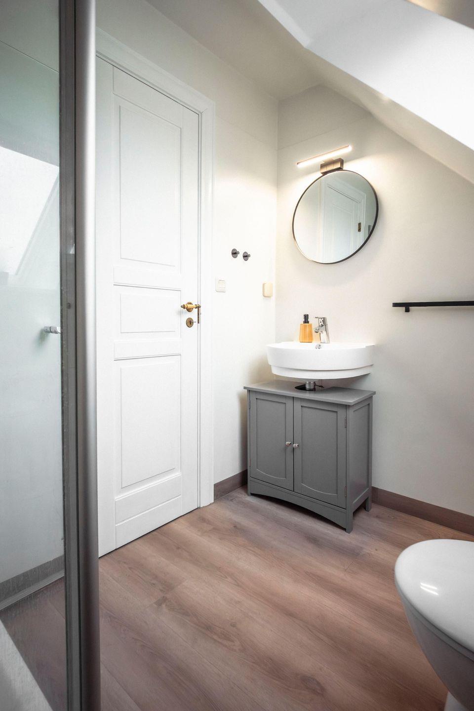 Das Haus verfügt über zwei moderne Badezimmer mit jeweils einer Dusche, Waschbecken, Spiegel und warmem Wasser. Rauchmelder und Feuerlöscher sorgen zusätzlich für Sicherheit.