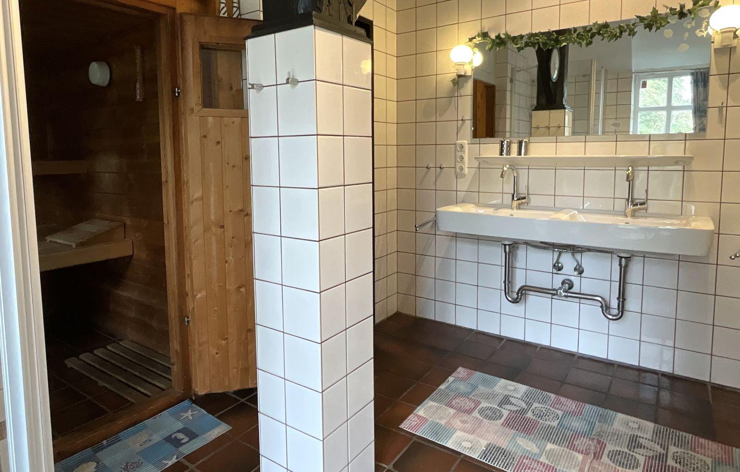 Bad 1 (Erdgeschoss) : mit Badewanne, Dusche, Waschtischanlage mit Spiegel, WC, Sauna
