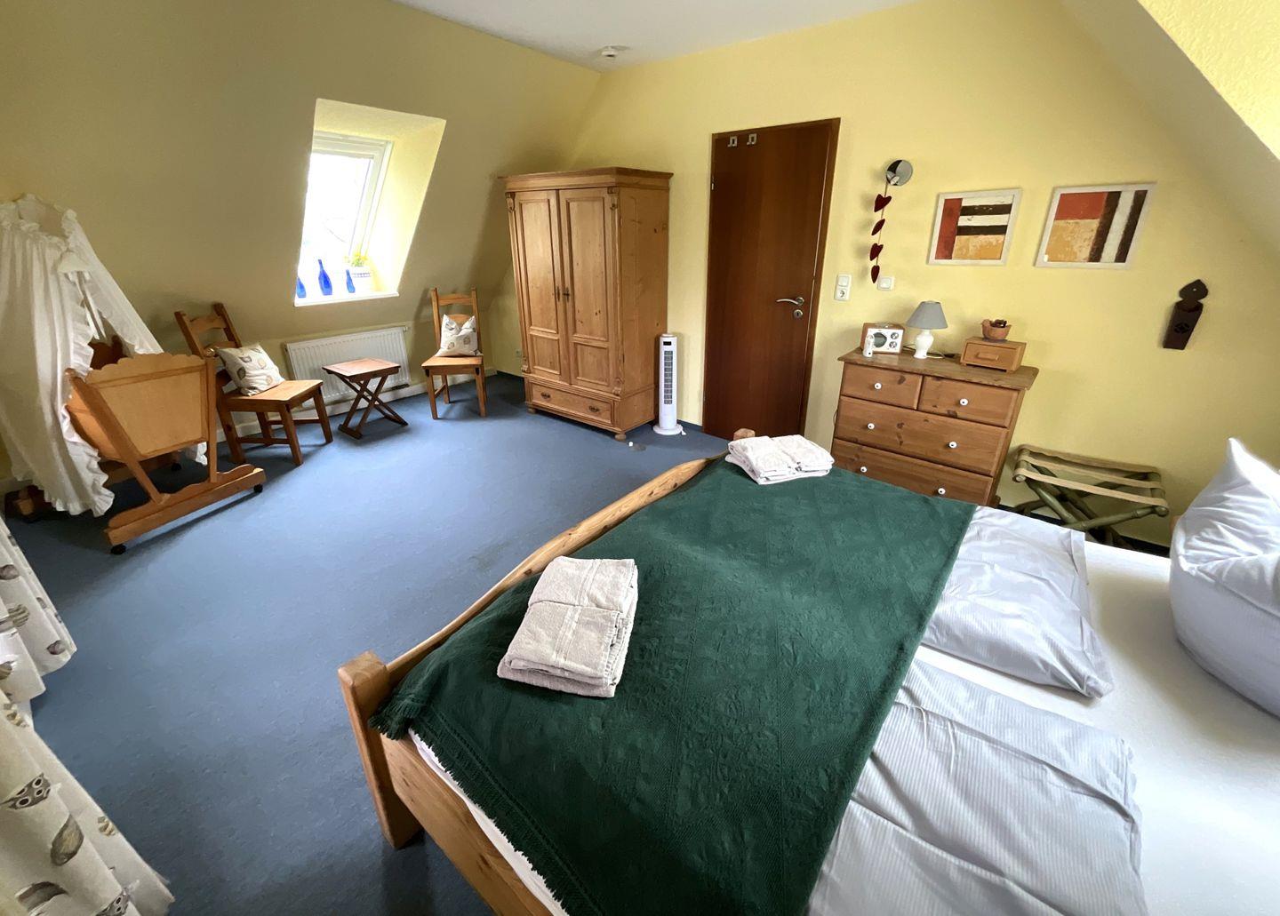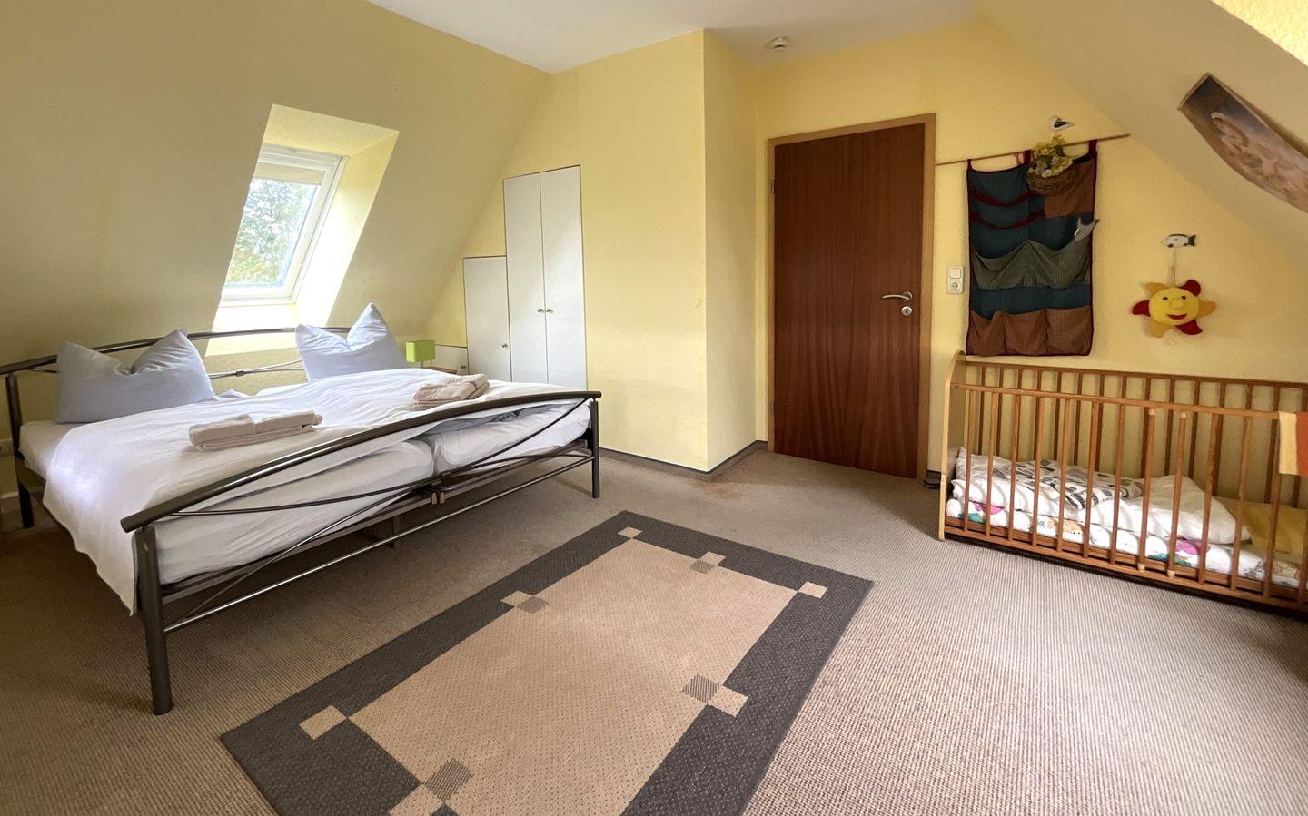 Schlafzimmer 4 (1. Etage): Doppelbett (Maße: 180 x 200 cm) mit 2 einzelnen Matratzen à 90x200 cm, Leselampe, Kleiderschrank, Kindergitterbett, Bettwäsche auf Anfrage