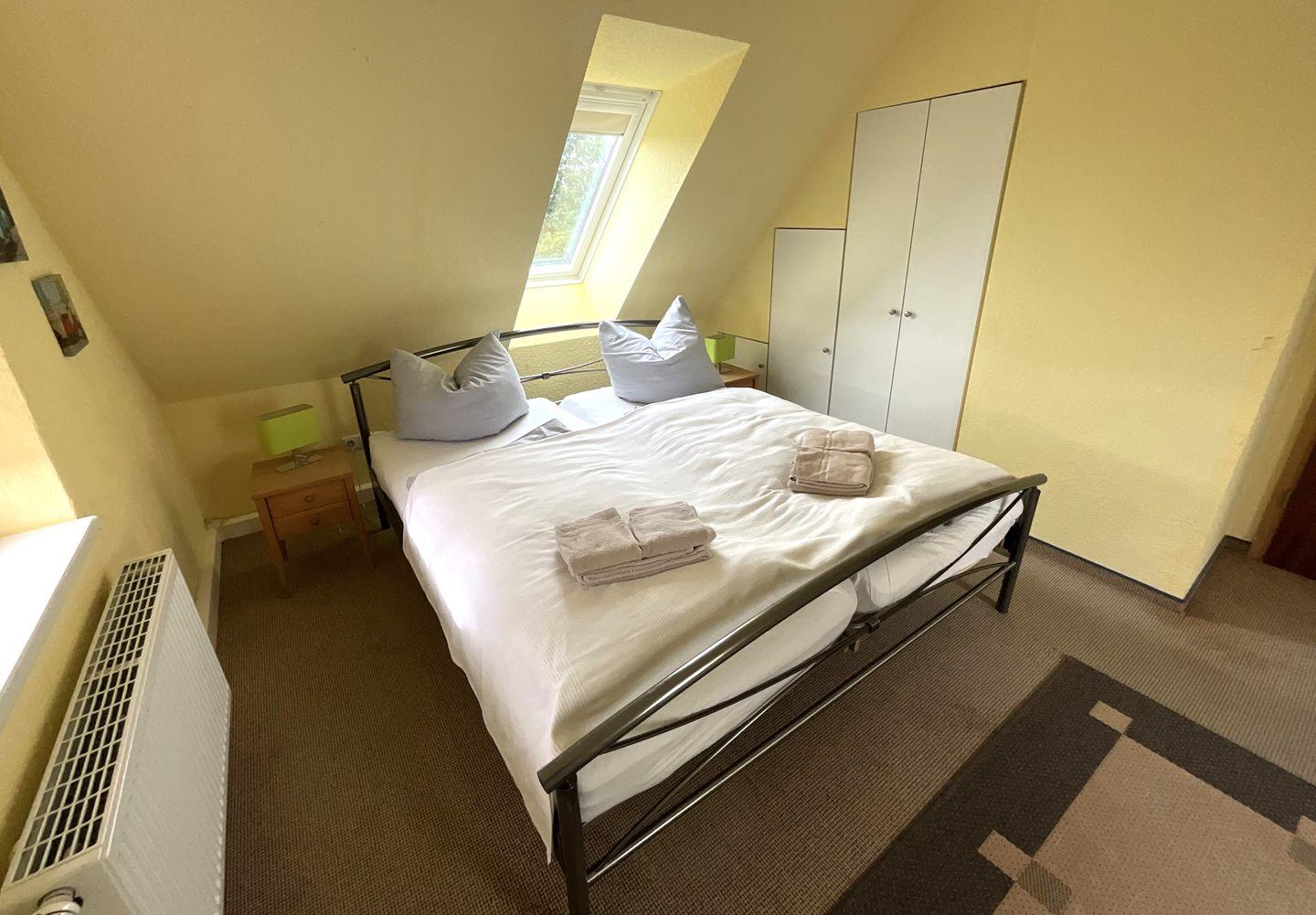 Schlafzimmer 2 (1. Etage): Doppelbett (Maße: 180 x 200 cm) mit 2 einzelnen Matratzen à 90x200 cm, Leselampe, Kleiderschrank, Babywiege, Bettwäsche auf Anfrage