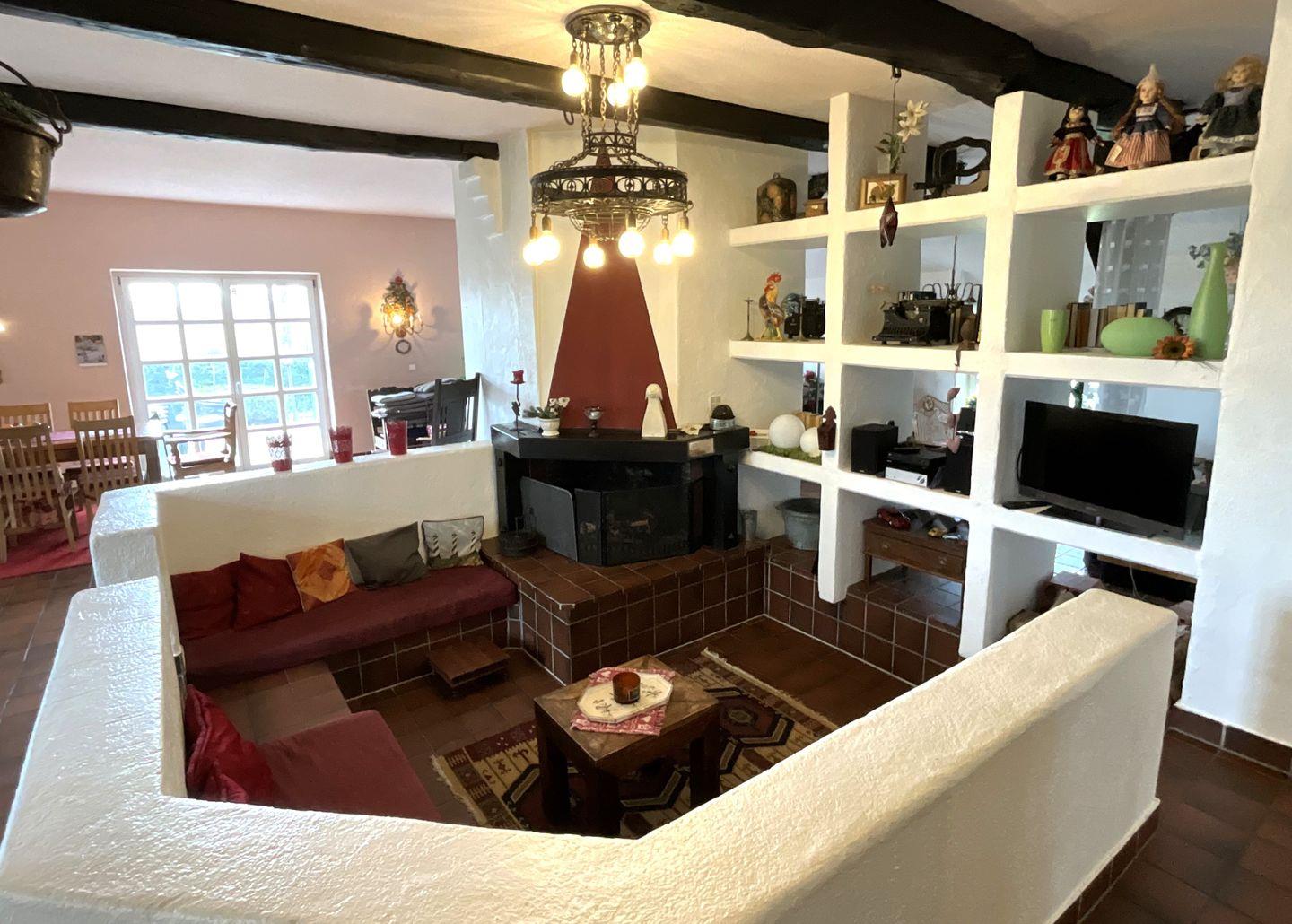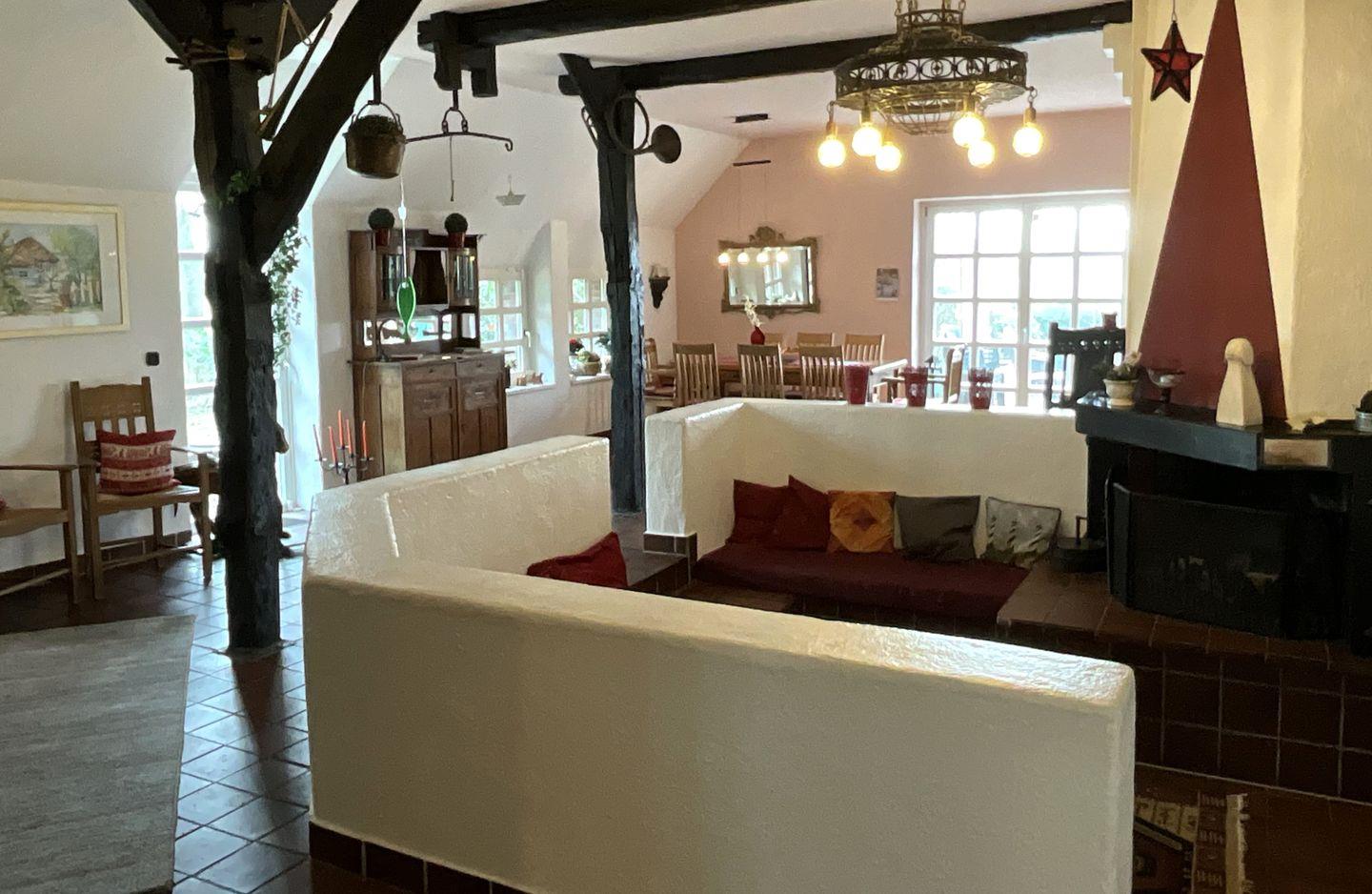 Wohnzimmer: großer Kaminbereich mit Sitzgelegenheiten, verschiedene gemütliche Sitzecken, großer Esstisch mit bequemen Stühlen Leselampen, Flachbildfernseher, Empfang deutschsprachiger TV-Programme (SAT-Anlage), Radio