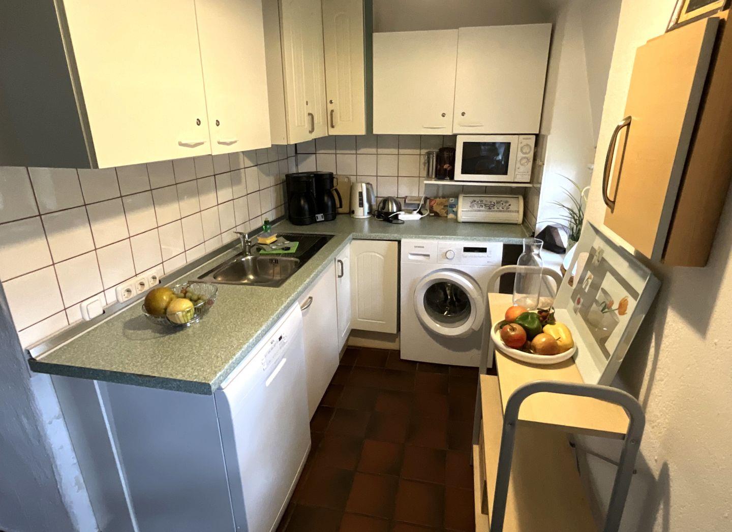 Küche und Haushalt: Einbauküche, Kühlschrank mit Gefrierfach, 4-Zonen Cerankochfeld, Backofen, Mikrowelle, Dunstabzugshaube, Geschirrspüler, Toaster, Wasserkocher, Kaffeefiltermaschine, hochwertiges Geschirr und Besteck