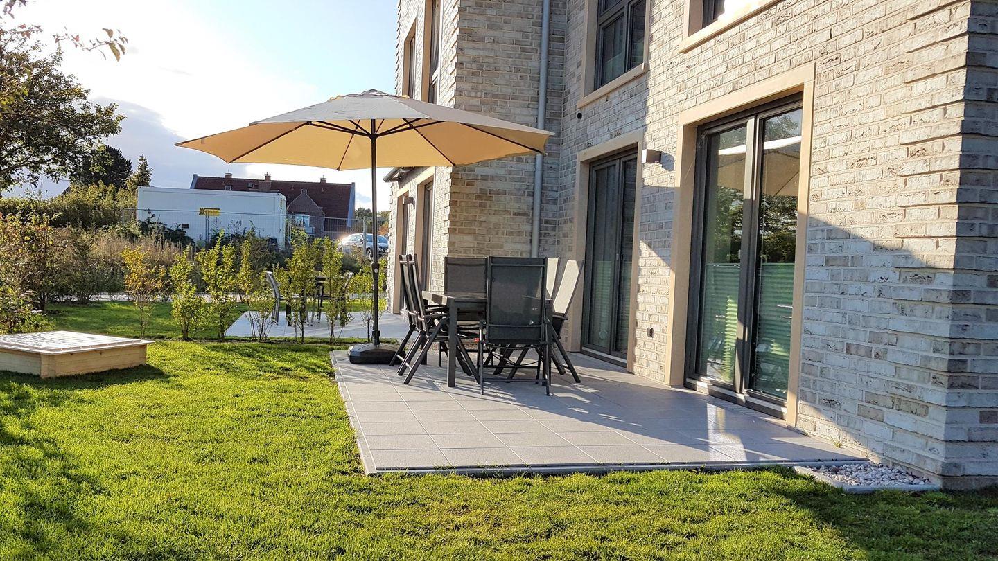 (Süd-)Terrasse mit Tisch und Stühlen für 6 Personen (ausziehbar, 2 weitere Gartenstühle vorhanden), 2 Sonnenliegen, Strandkorb, Holzkohlegrill, (Fahrrad-)Schuppen mit Stromanschluss (Lademöglichkeit E-Bike), großer Sonnenschirm, Sandkiste, Garten- und Sandspielzeug