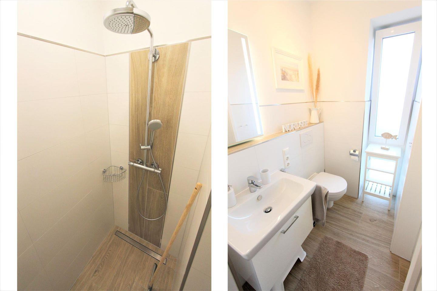 bodentiefe , barrierefreie Sommerregendusche, Waschtischanlage mit Spiegel, WC, Abstellregal, Kindertritt, aufsetzbarer Kinder-Toilettensitz, Handtuchhaken, Fenster zum Lüften