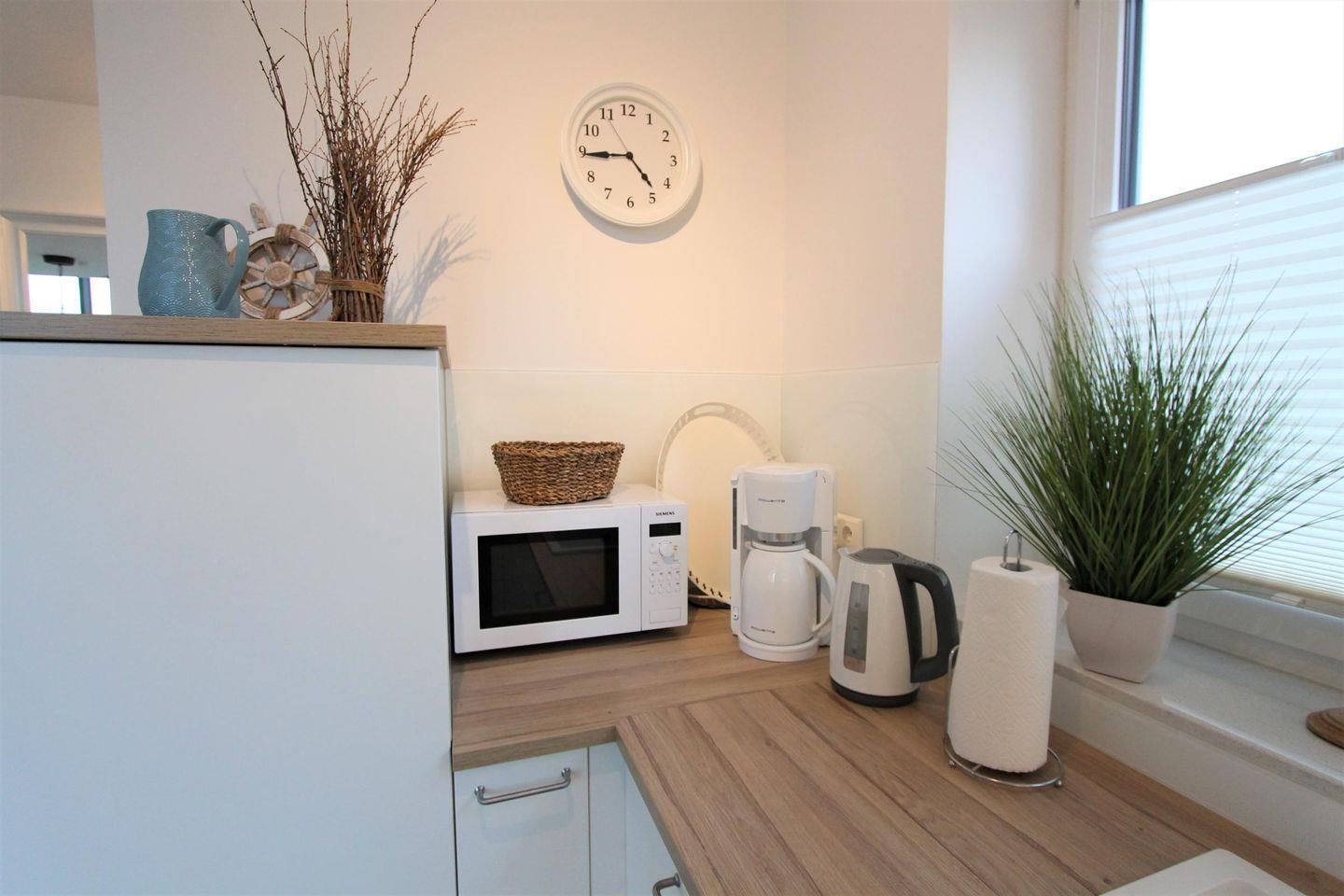 offene Einbauküche, Kühlschrank mit Gefrierfach, 4-Zonen Cerankochfeld, Backofen, Dunstabzugshaube, Mikrowelle, Geschirrspüler, Kaffeefiltermaschine, Toaster, Wasserkocher mit Temperatureinstellung, (Kinder-) Geschirr und Besteck, Töpfe und Pfannen, Mixer, Waage, Eierkocher, Thermoskanne