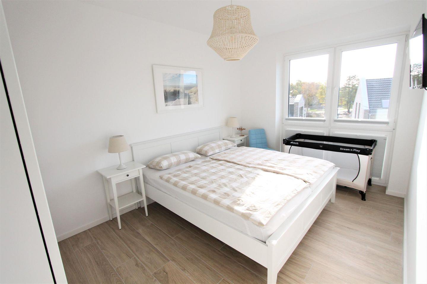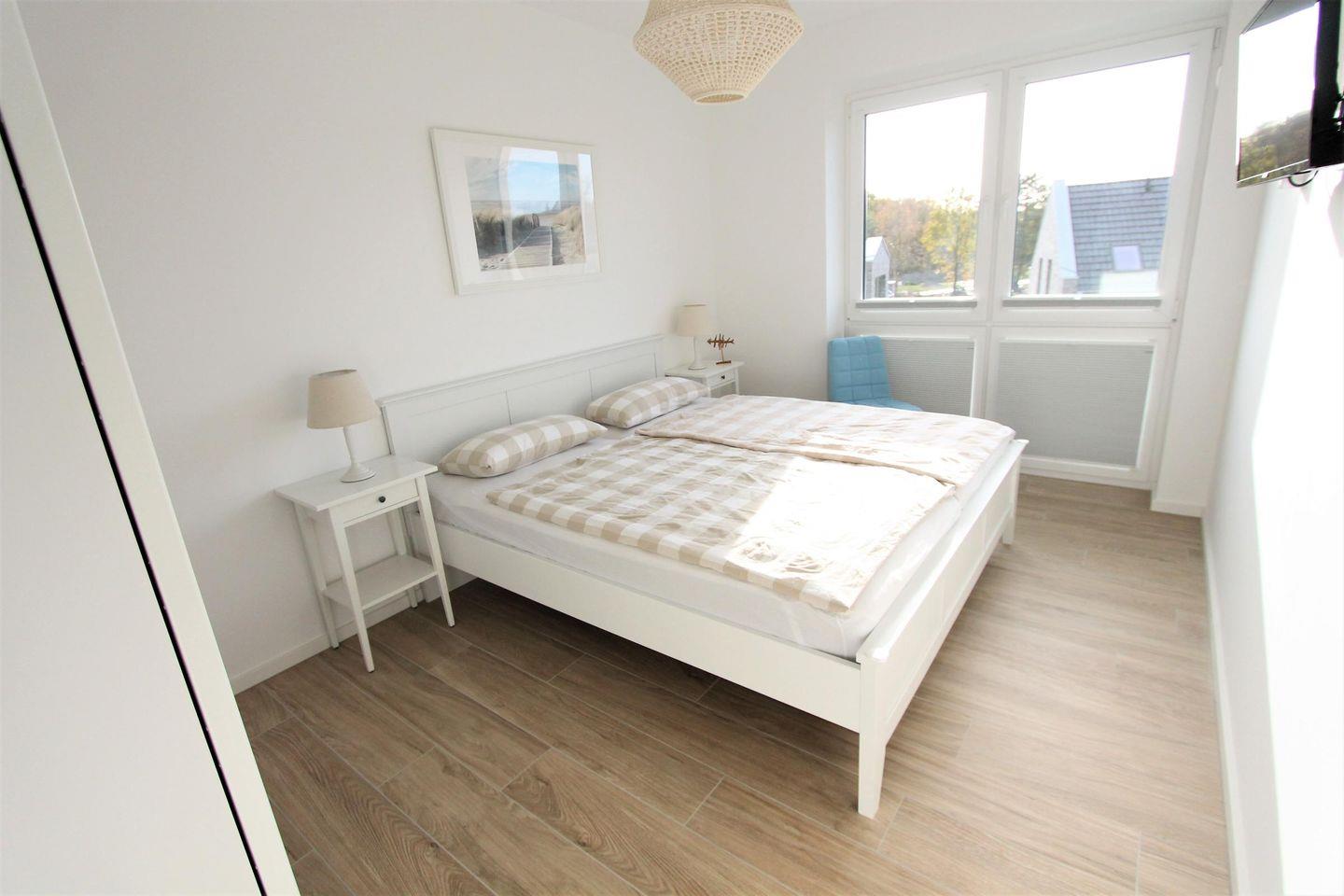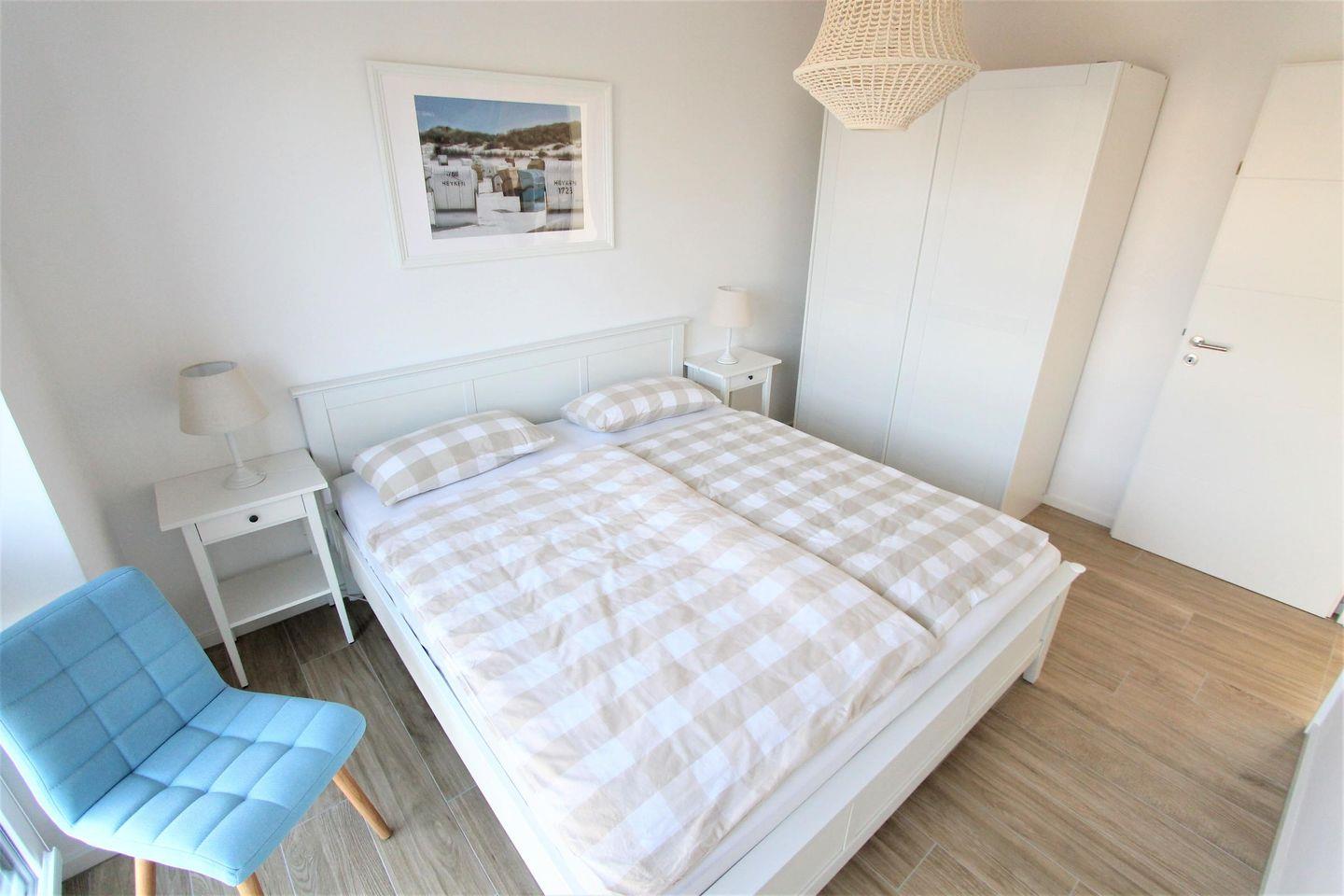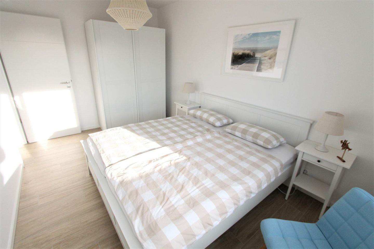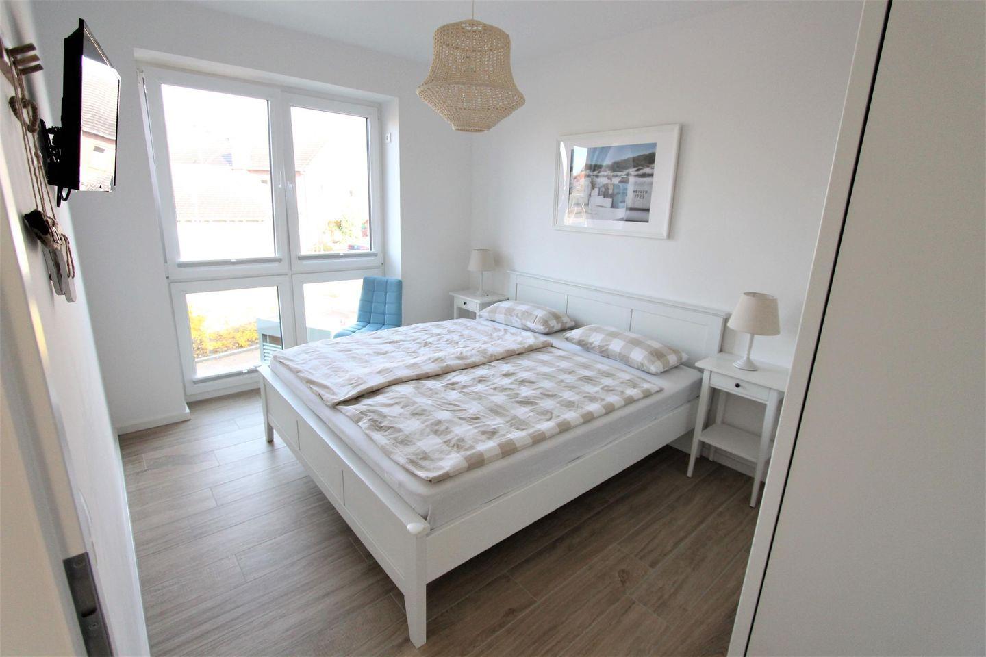 Doppelbett (Maße: 180 x 200 cm- durchgängige Matratze), Nachttische, Kleiderschrank, Stuhl, Fernseher, Verdunklungsmöglichkeit