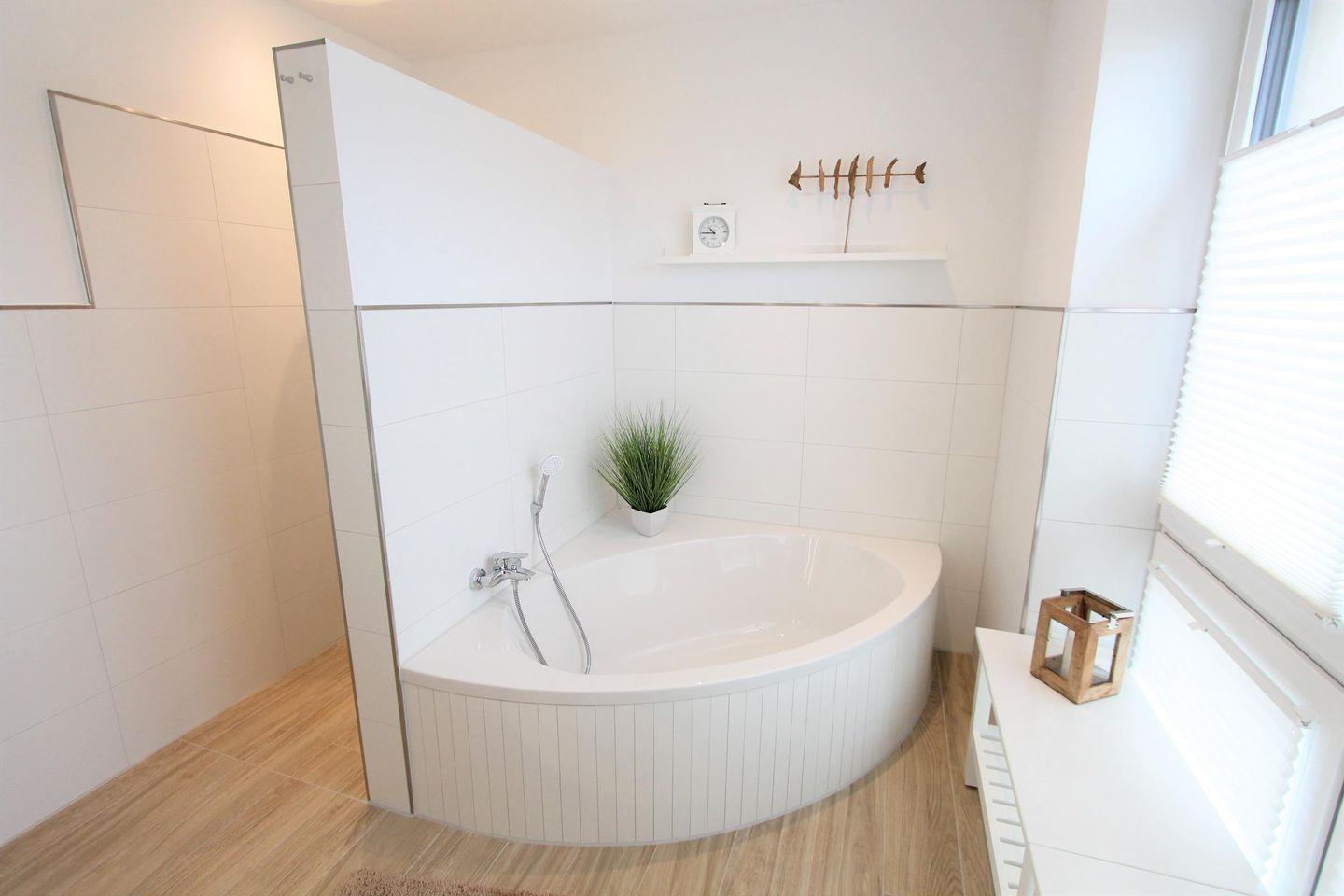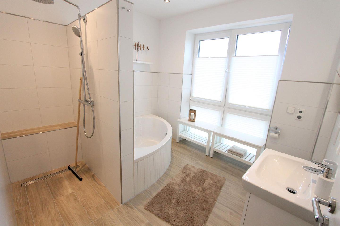 bodentiefe, barrierefreie Sommerregendusche mit großer Sitz-/Ablagemöglichkeit, Eckbadewanne, Waschtischanlage mit Spiegel, Schminkspiegel, WC, Handtuchheizung, Föhn, Einbauradio, Abstellflächen, Handtuchhaken