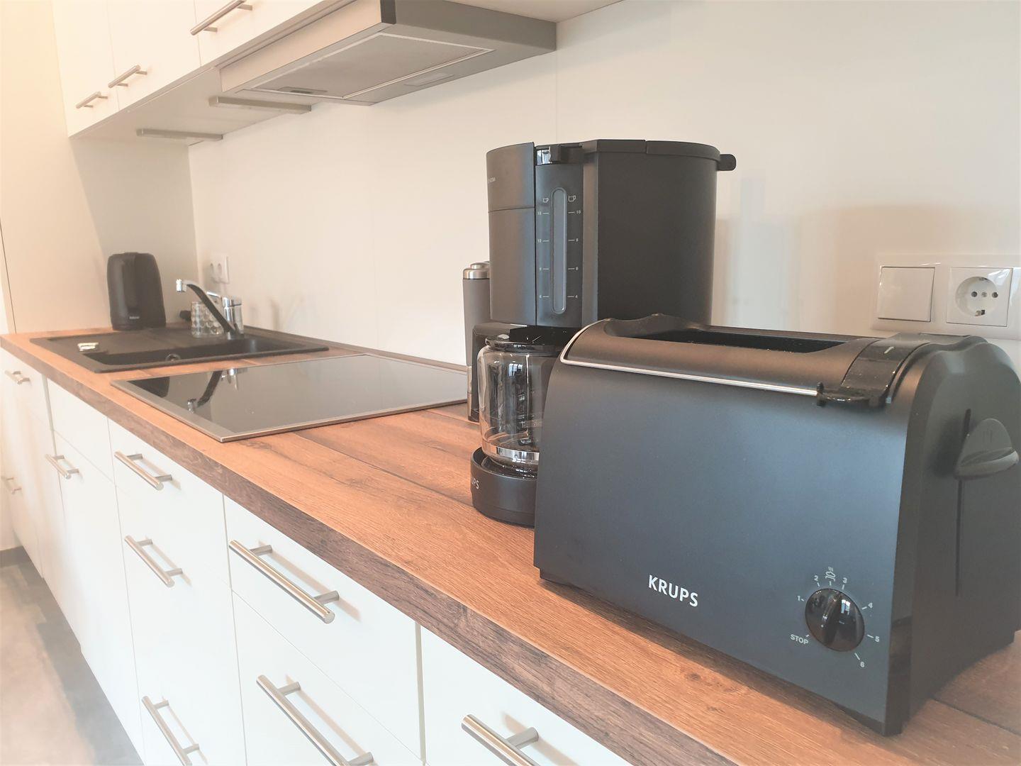 Küche und Haushalt: Einbauküche, Kühlschrank mit Gefrierfach, 4-Zonen Cerankochfeld, Backofen, Dunstabzugshaube, Geschirrspüler, Kaffeefiltermaschine, Toaster, Wasserkocher, hochwertiges Geschirr und Besteck
