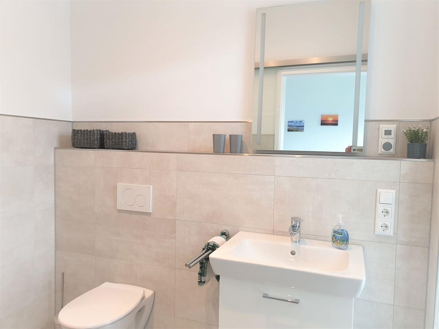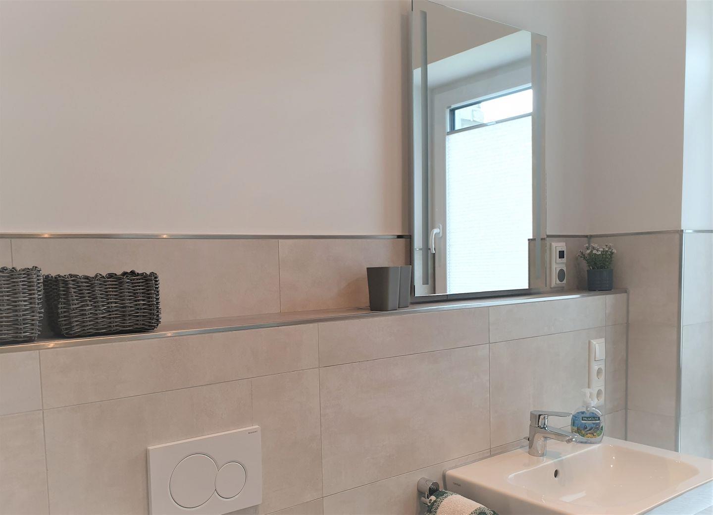 Bad und Sanitär: bodentiefe, barrierefreie Sommerregendusche, Waschtischanlage mit Spiegel, WC, Handtuchheizung, Handtücher (1 Duschtuch + 2 Handtücher) und Bettwäsche auf Anfrage