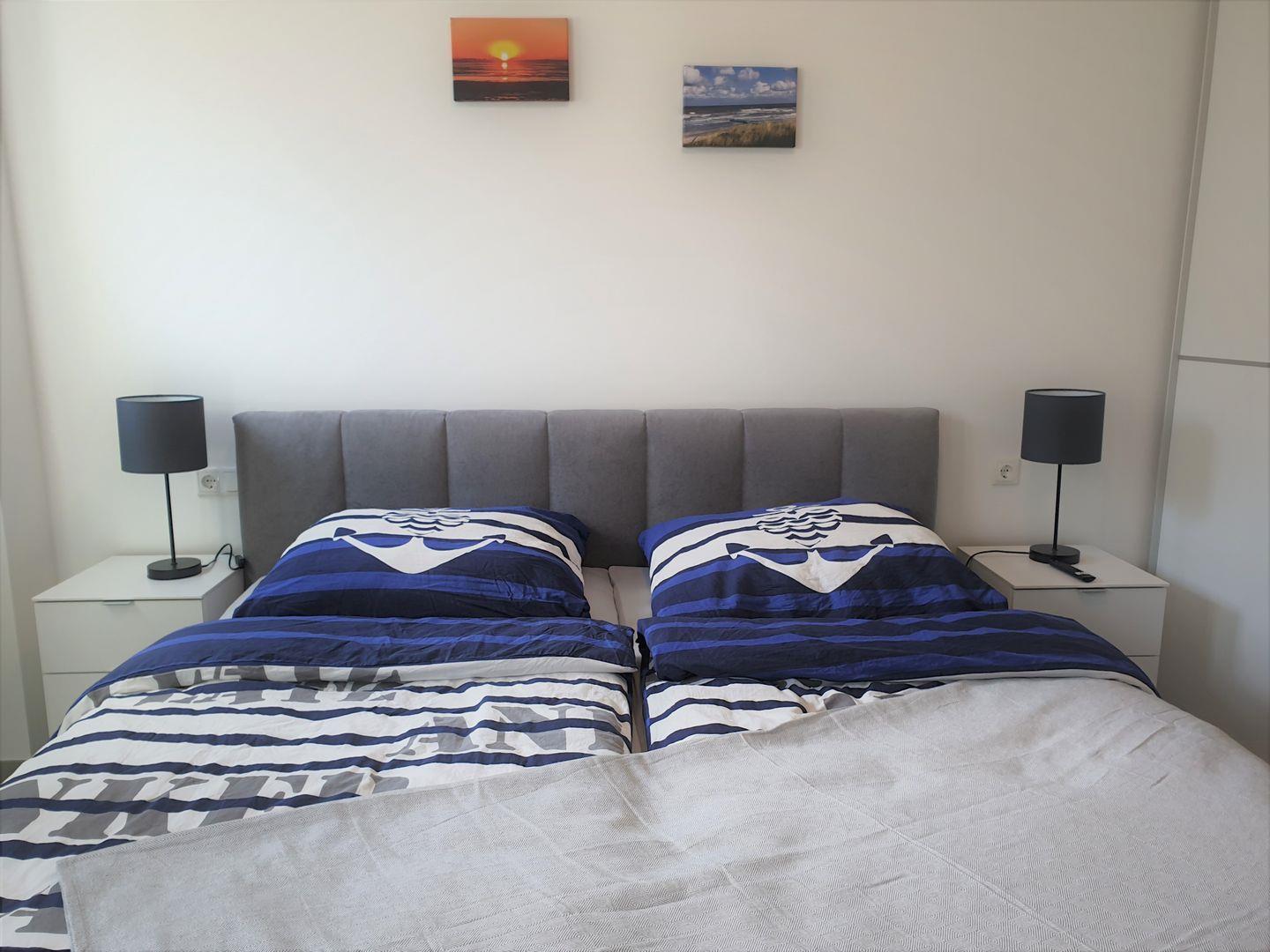 Schlafzimmer: Doppelbett (Maße: 180 x 200 cm) mit 2 Einzelmatratzen, Leselampen, Kleiderschrank, Fernseher