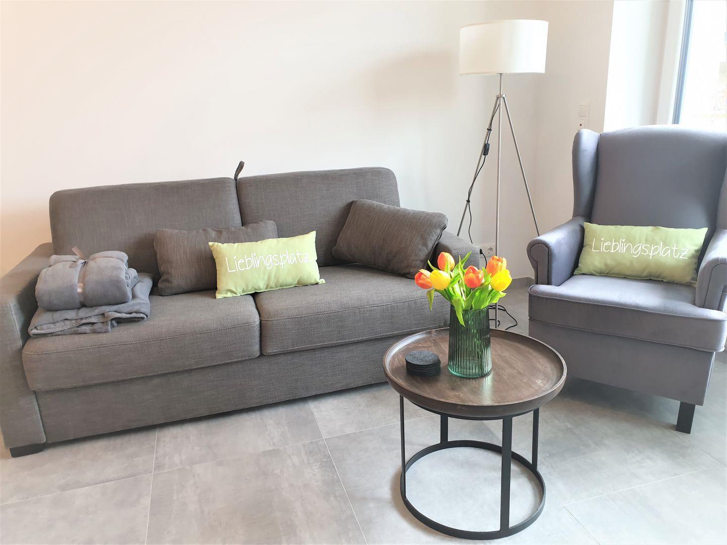 Wohnzimmer: gemütliche Couch mit Ausziehfunktion, Sessel, Flachbildfernseher, Empfang deutschsprachiger TV-Programme (SAT-Anlage)