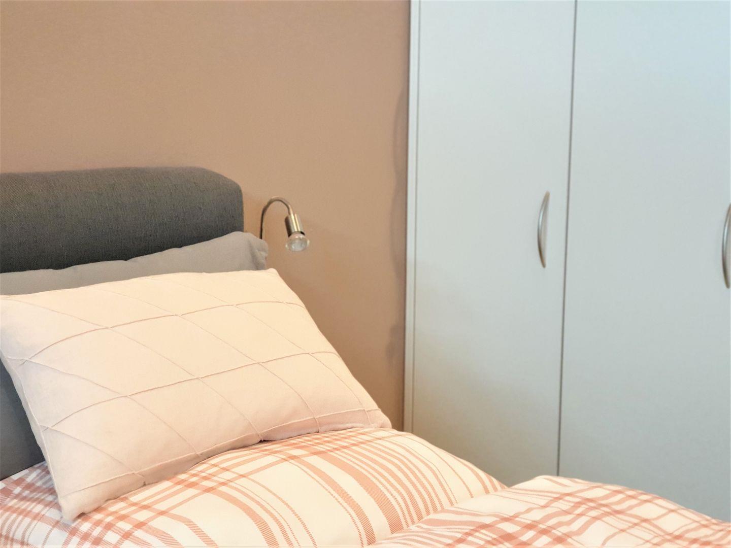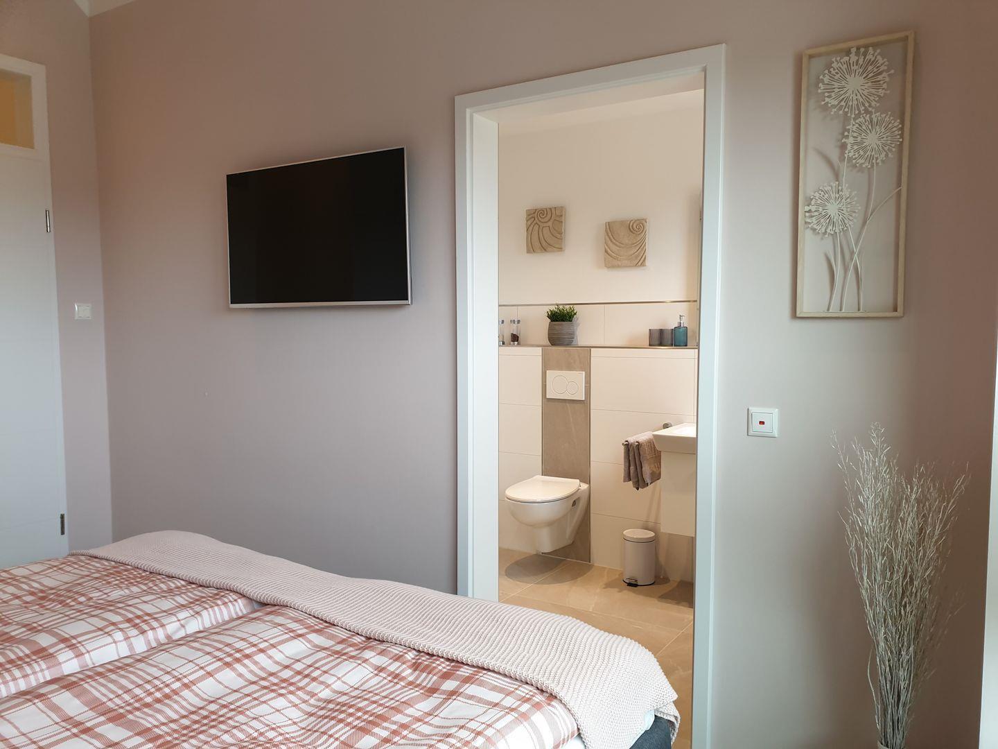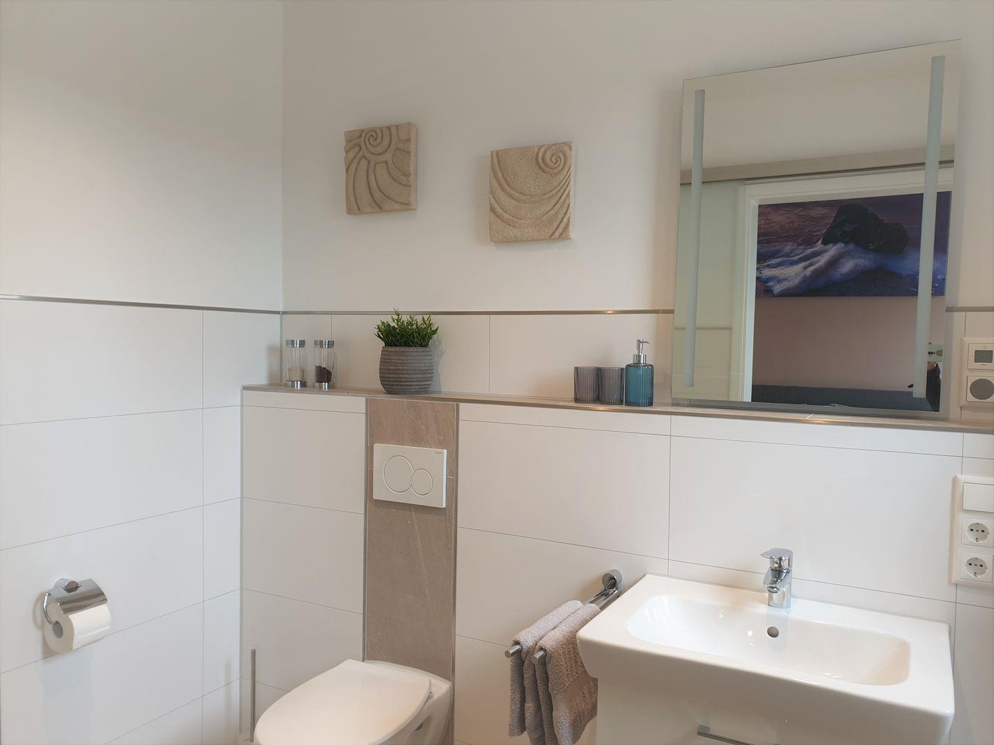 Bad und Sanitär: bodentiefe, barrierefreie Regenwalddusche, Waschtischanlage mit Spiegel, WC, Handtuchheizung, Einbauradio, Handtücher (1 Duschtuch + 2 Handtücher) und Bettwäsche auf Anfrage