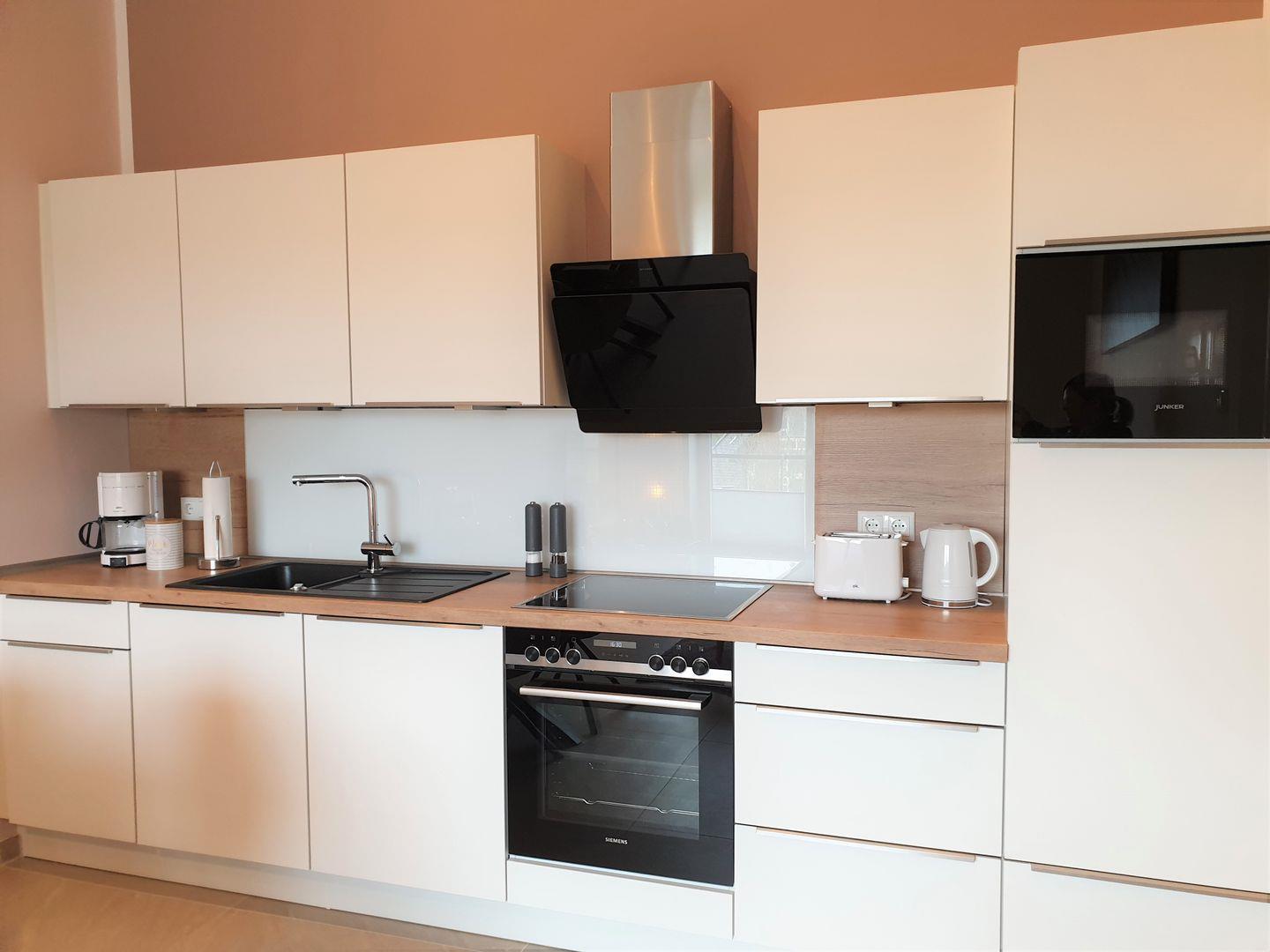 Küche und Haushalt: Einbauküche, Kühlschrank mit Gefrierfach, 4-Zonen Cerankochfeld, Backofen, Einbaumikrowelle, Dunstabzugshaube, Geschirrspüler, Kaffeefiltermaschine, Nespresso-Kapselmaschine, Toaster, Eierkocher, Mixer, Wasserkocher, Pürierstab, hochwertiges Geschirr und Besteck