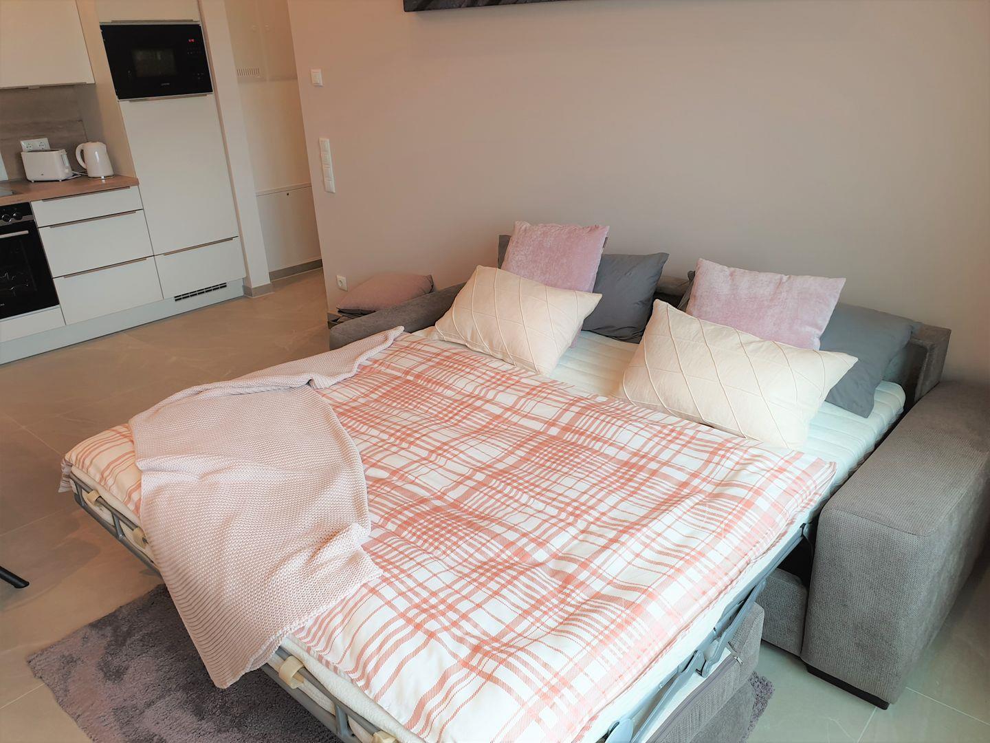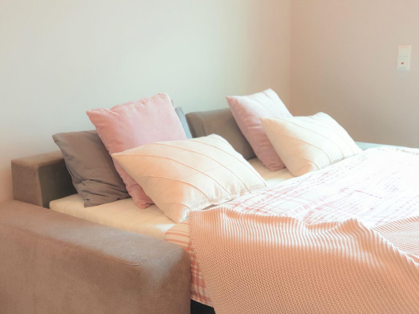 Wohnzimmer: Schlafsofa (Maße: 180 x200 cm), Flachbildfernseher, Empfang deutschsprachiger TV-Programme (SAT-Anlage), DVD-Player, großzügige Spielesammlung