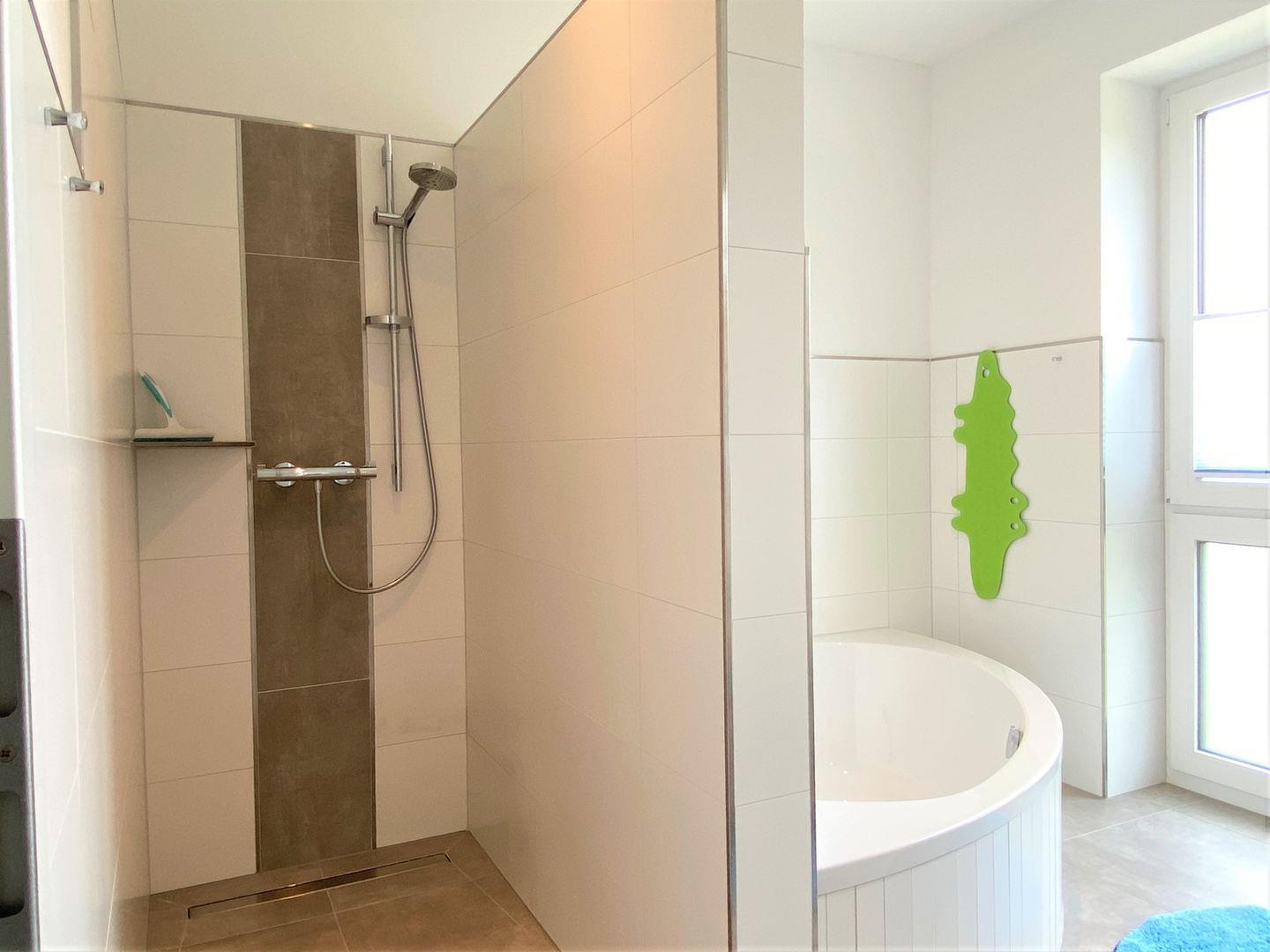 Duschbad im 1. OG: bodentiefe, barrierefreie Dusche, Badewanne, Waschtischanlage mit Spiegel, WC, Handtuchheizung, Föhn