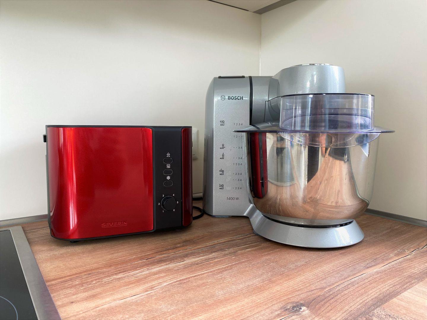 Küche und Haushalt: Einbauküche, Kühlschrank mit Gefrierfach, 4-Zonen Cerankochfeld, Backofen, Dunstabzugshaube, Mikrowelle, Geschirrspüler, Kaffeefiltermaschine, Toaster, Wasserkocher, Eierkocher, hochwertiges Geschirr und Besteck