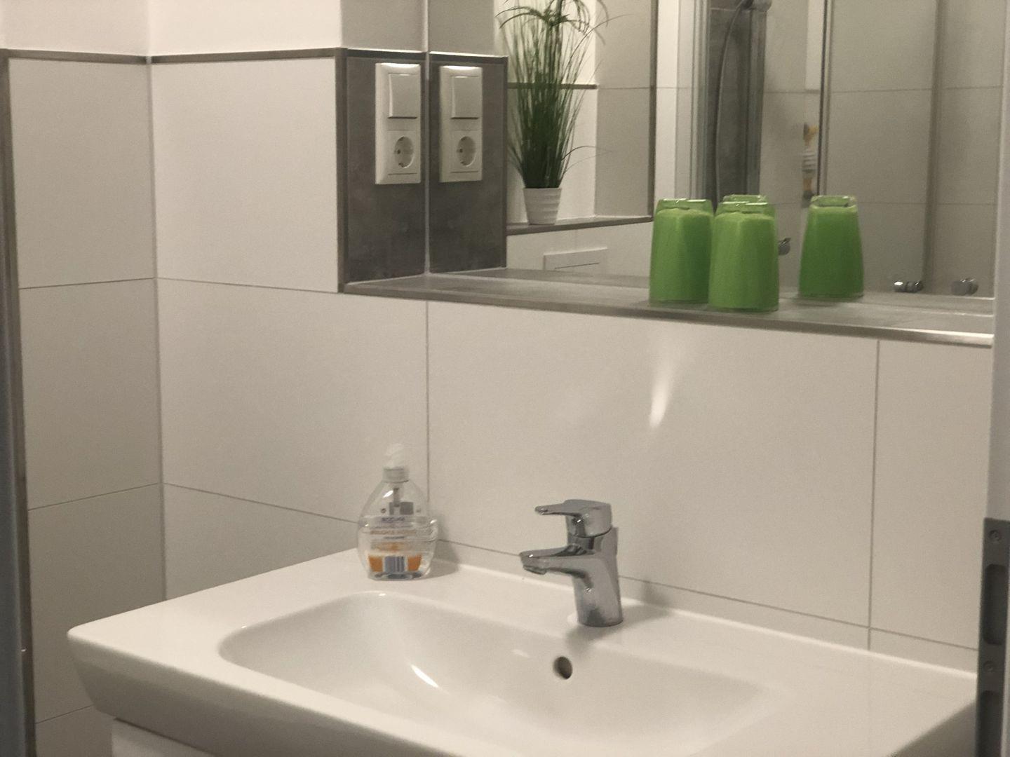 Das Duschbad ist eine bodengleiche Dusche, eine Handtuchheizung sowie der beleuchtete Spiegel als Nische über dem Waschbecken bieten allerhöchsten Komfort.