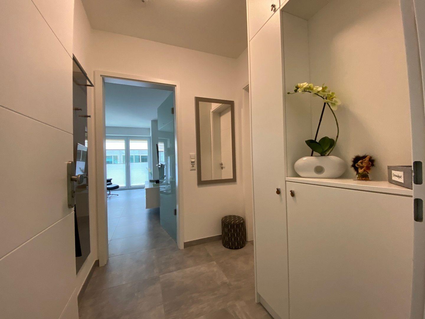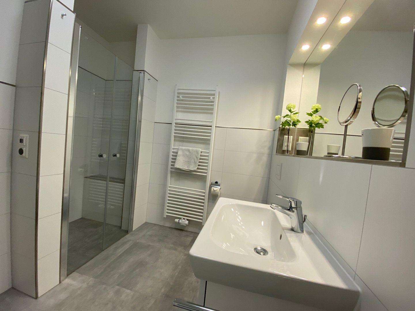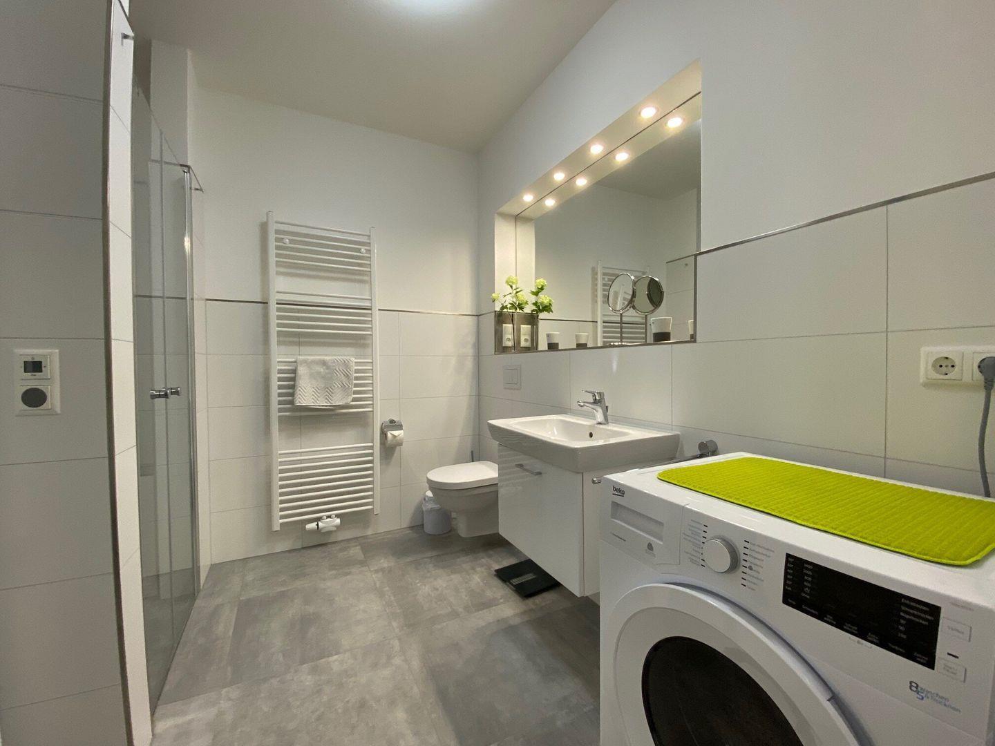 Die Wohnung verfügt über ein geschmackvoll eingerichtetes Schlafzimmer und ein modernes Badezimmer mit einer bodengleichen Dusche, die Ihnen einen komfortablen Aufenthalt garantiert. Die offene Küche zum Wohnzimmer ist mit hochwertigen Geräten ausgestattet, darunter ein Ceranherd, Backofen, Mikrowelle und Geschirrspüler. Hier können Sie Ihre kulinarischen Fähigkeiten entfalten und leckere Gerichte zubereiten. Alles, was Sie dafür benötigen – vom Kühlschrank bis zur Kaffeemaschine – ist vorhanden. Genießen Sie Ihre Mahlzeiten am großzügigen Esstisch oder auf dem Balkon mit Blick ins Grüne, der einladend zum Verweilen einlädt.