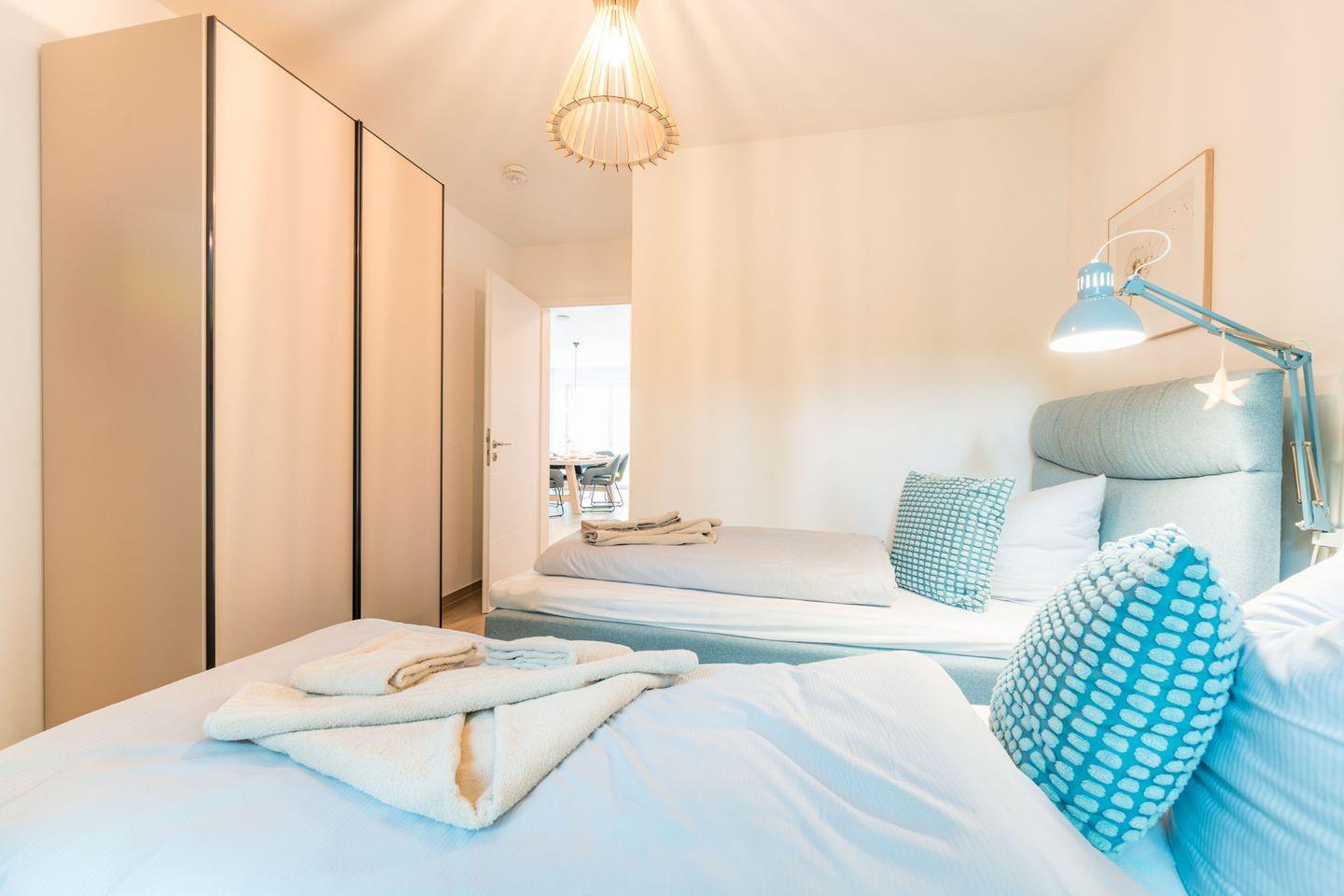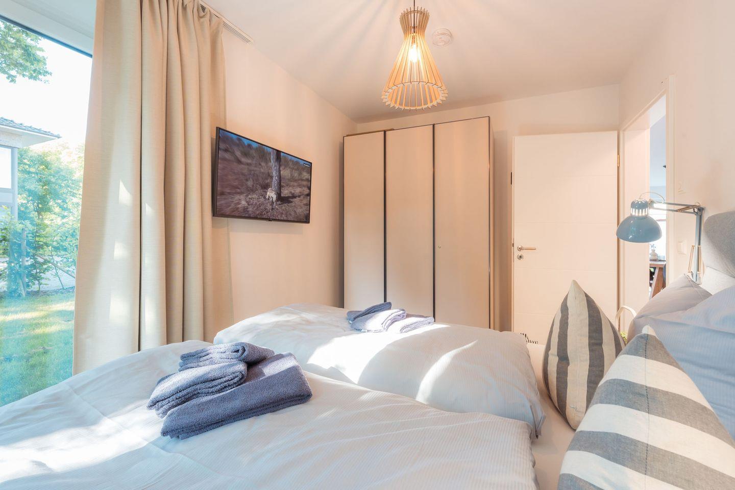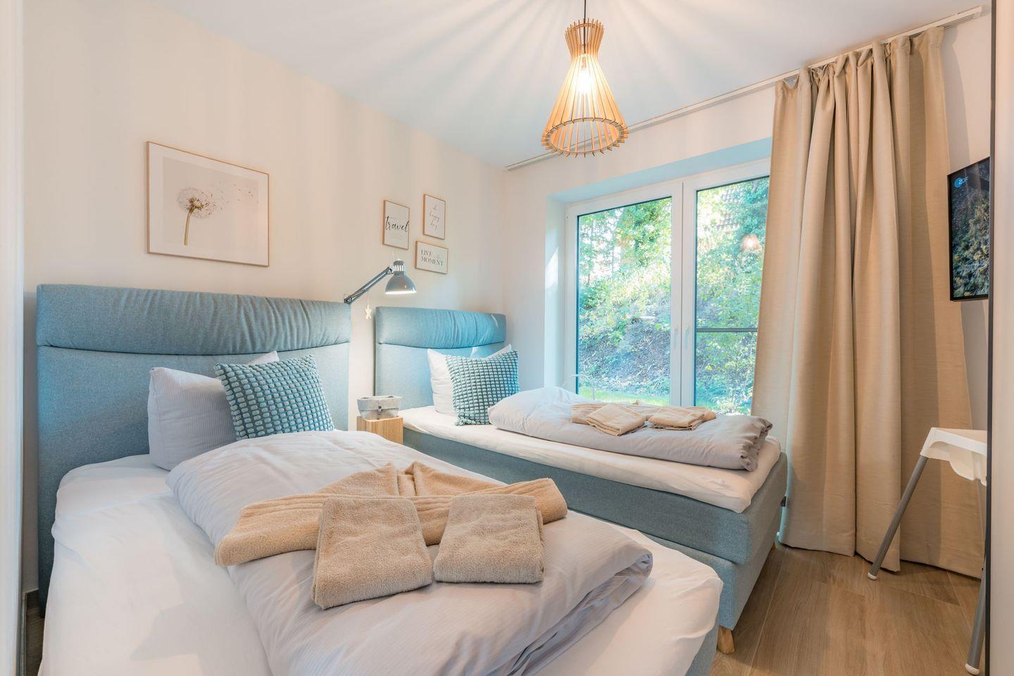 Schlafzimmer 2: 2 Einzelbetten (Boxspringbett 100 x 200 cm) , Flat-TV ebenfalls mit Unterstützung von Streamingdiensten über Apps oder eigene Geräte, Leselampen, Kleiderschrank, Verdunklungsgardinen, Bettwäsche auf Anfrage